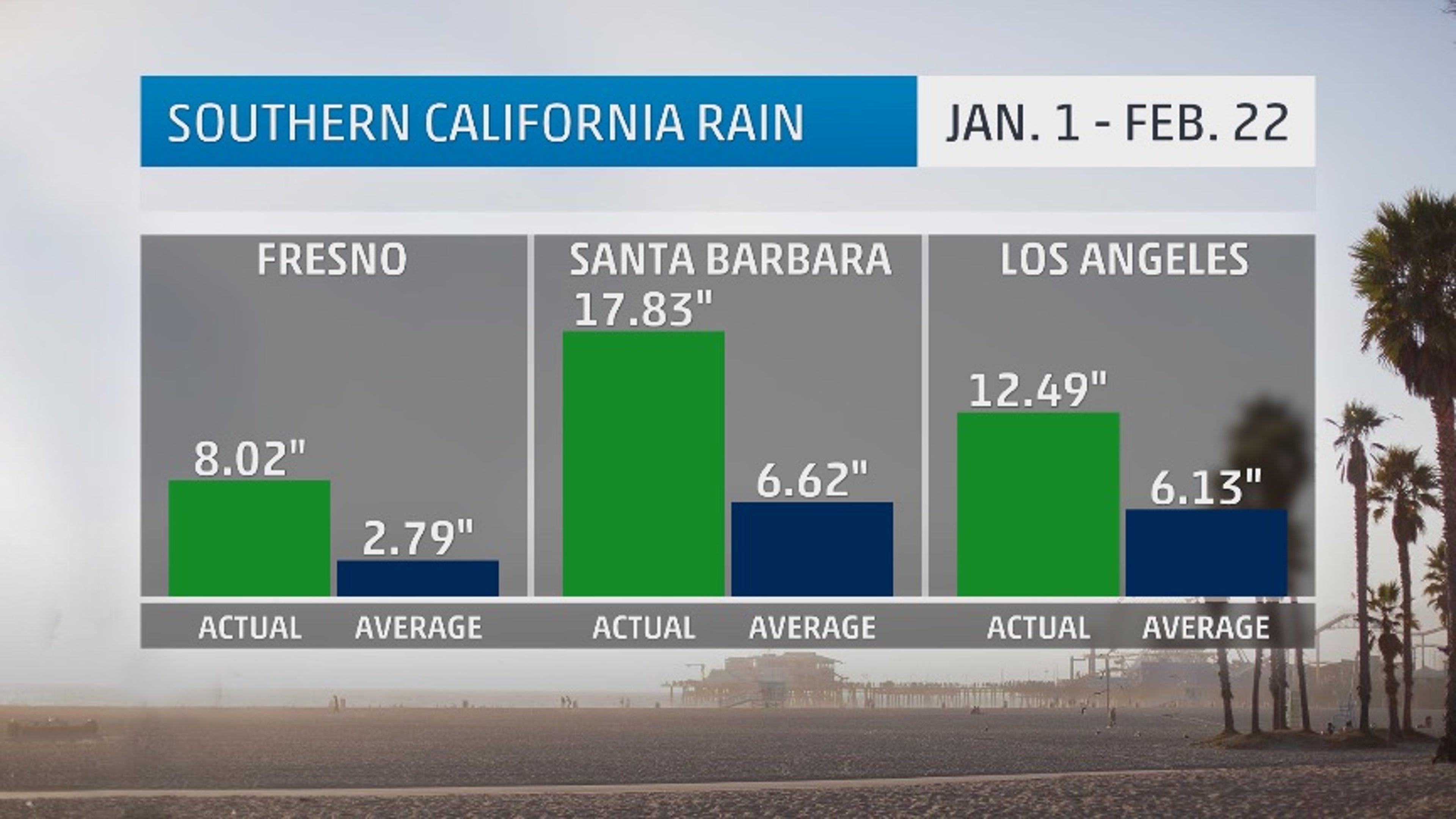 Locations from Fresno to Los Angeles have also seen greater-than-average rainfall. Through Wednesday, Santa Barbara and Long Beach were more than 10 inches above average. Los Angeles has received 18.44 inches of rain, with 12.49 inches of that rain falling since Jan. 1.