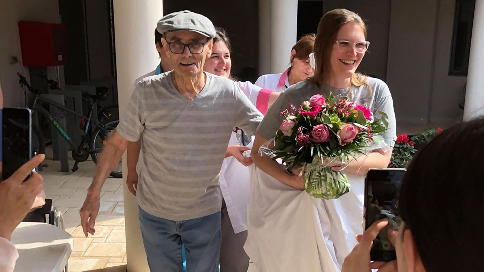 Auf diesem vom Pflegeheim Vilanova zur Verfügung gestellten Foto lächelt der Bewohner Chatal (Links) während einer gespielten Hochzeit mit einer Krankenschwester am 25. April 2020 in Corbas, Zentralfrankreich.
