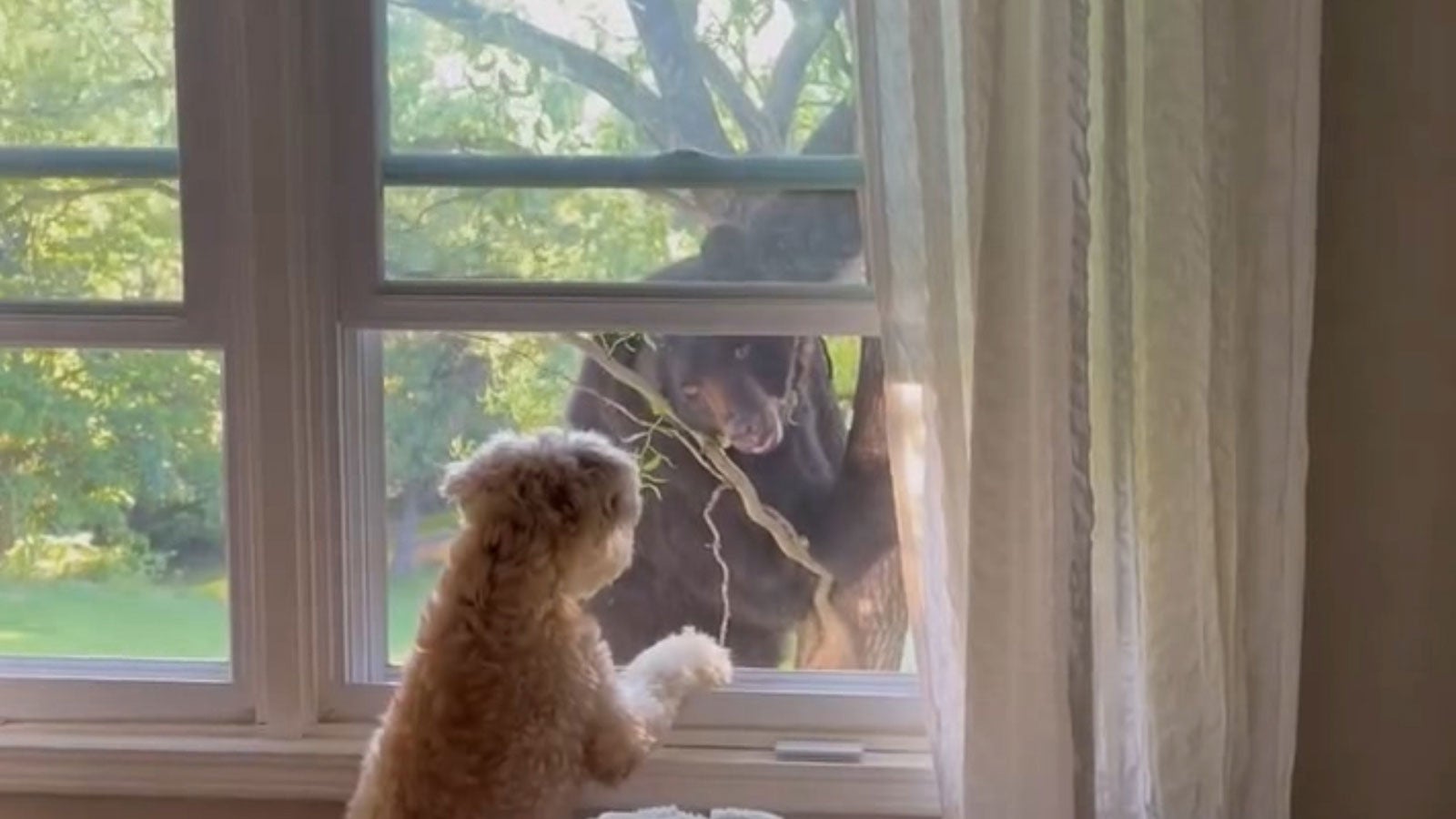 Dieser Hund beobachtet ganz genau, was der Bär da vor seinem Fenster macht. Der Bär war zuvor auf den Baum geklettert, um an das Futter in einem Vogelhäuschen zu kommen.