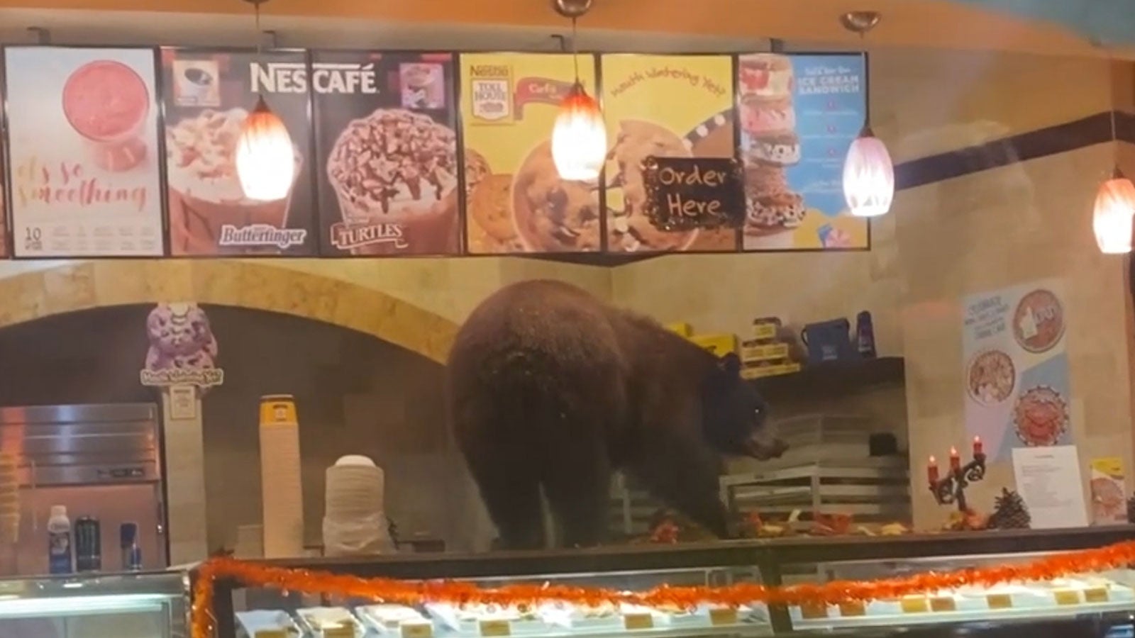 Bär mit Heißhunger steigt in Café ein