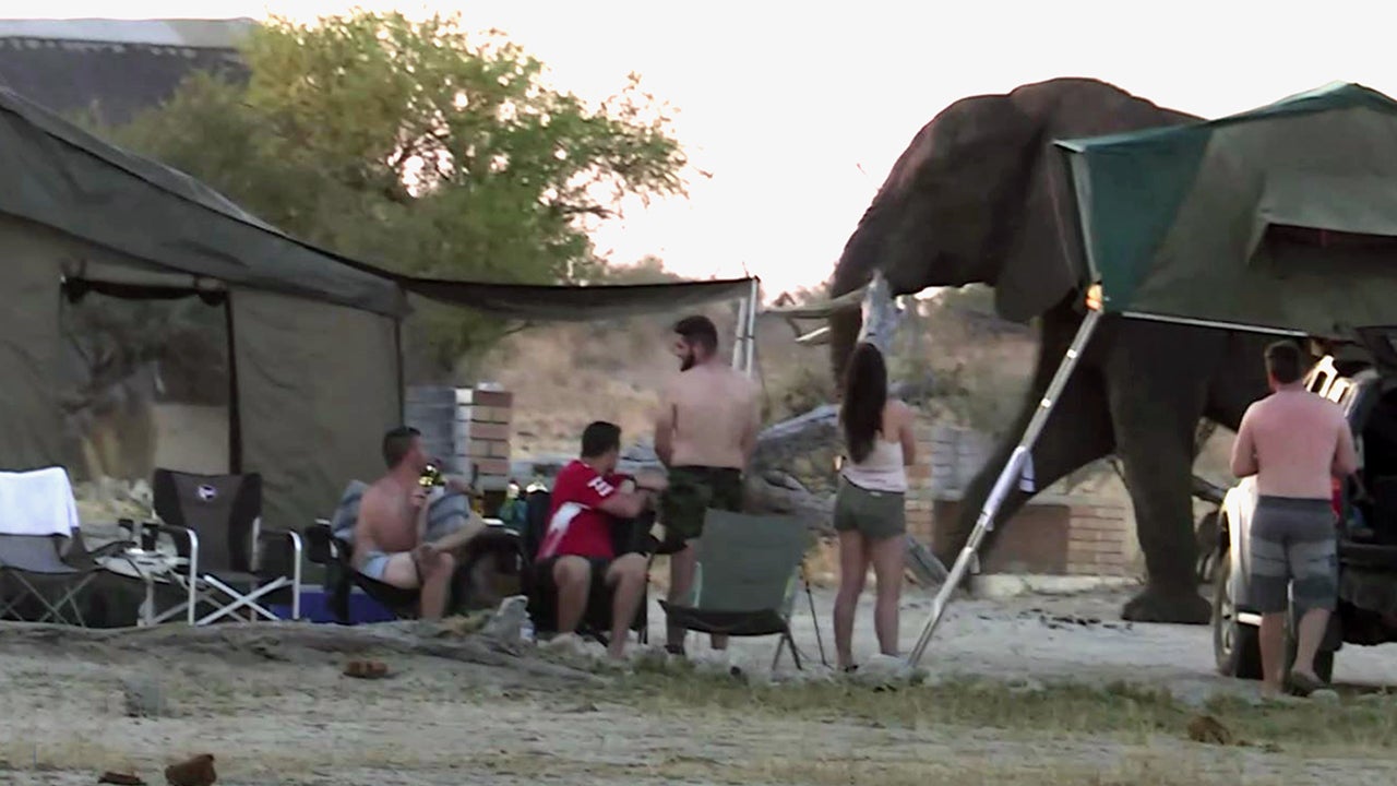 Ein Elefantenbulle tauchte plötzlich in einem Camp auf, sehr zu Überraschung der anwesenden Urlauber. Die verdutzten Camper sahen dabei zu, wie der Dickhäuter durchs Camp stolzierte und lautstark auf sich aufmerksam machte.
