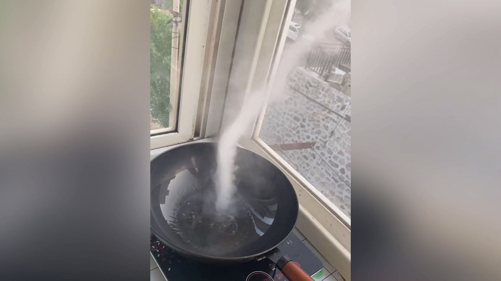 Eine Chinesin hat beim Kochen versehentlich einen Mini-Tornado in ihrer Küche ausgelöst. Sie öffnete ihr Fenster, schaltete den Dunstabzug ein und goss Öl in die Pfanne.