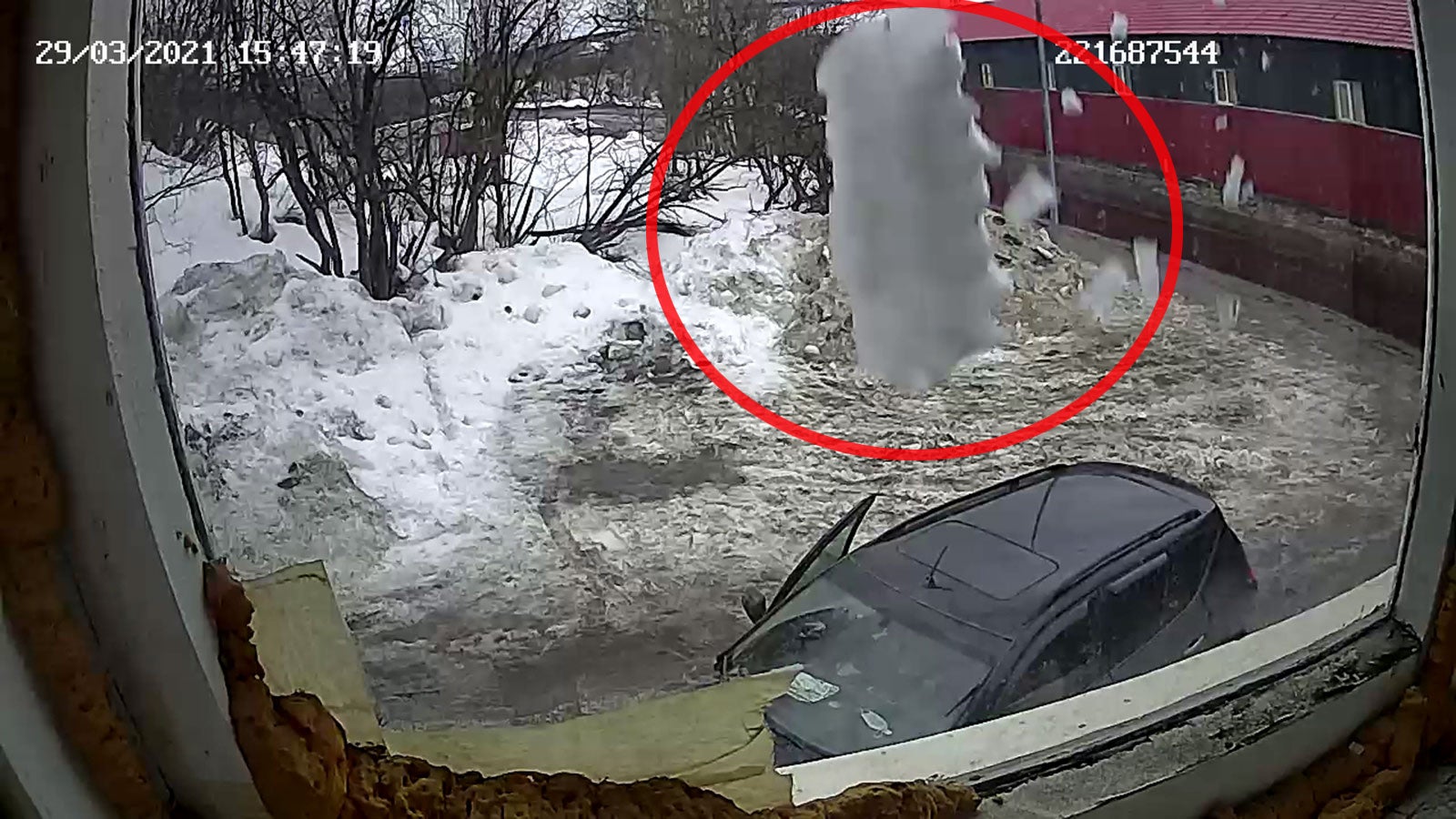 Zwei Autoinsassen bekommen den Schock ihres Lebens, als sich plötzlich ein riesiger Eisblock vom Dach löst. Der Fahrer vergisst sogar glatt, seinen Motor abzustellen.