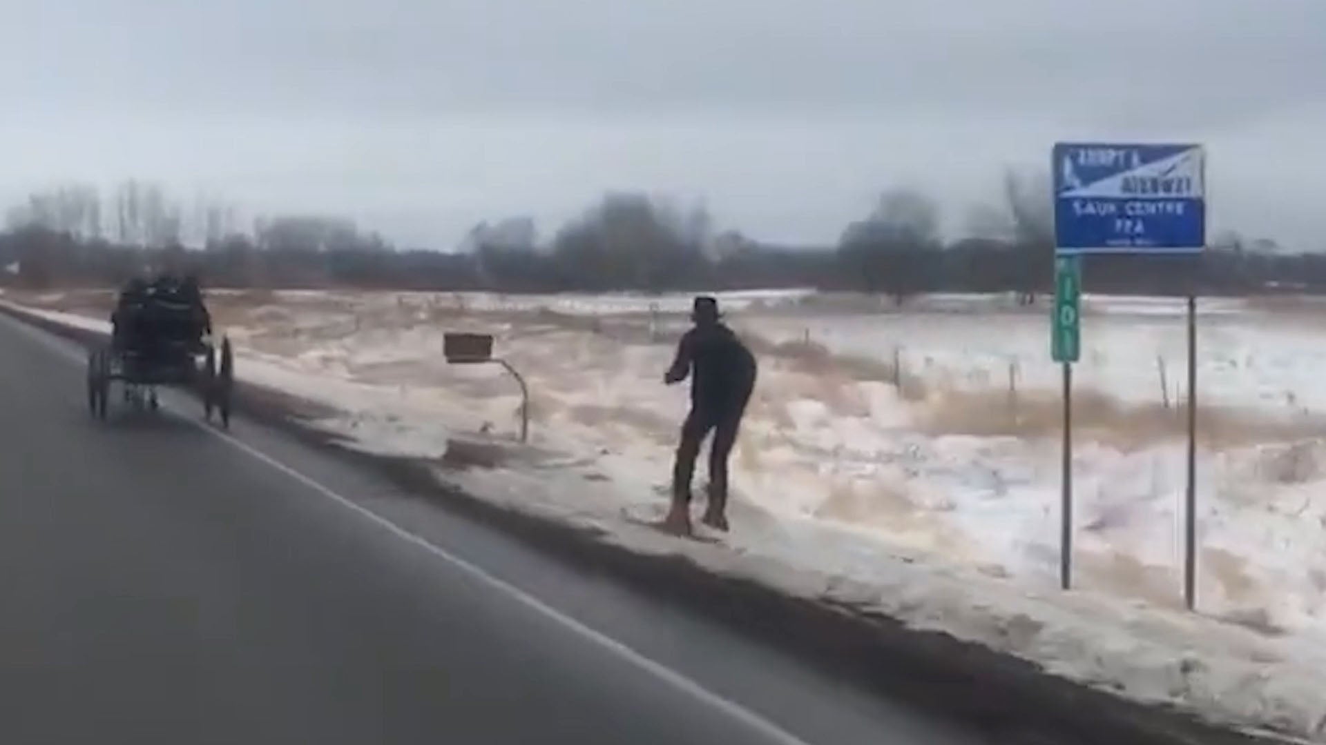 Wer sagt, man bräuchte Berge oder Hügel, um Ski zu fahren? Eine Pferdekutsche und ein Seil reichen auch.