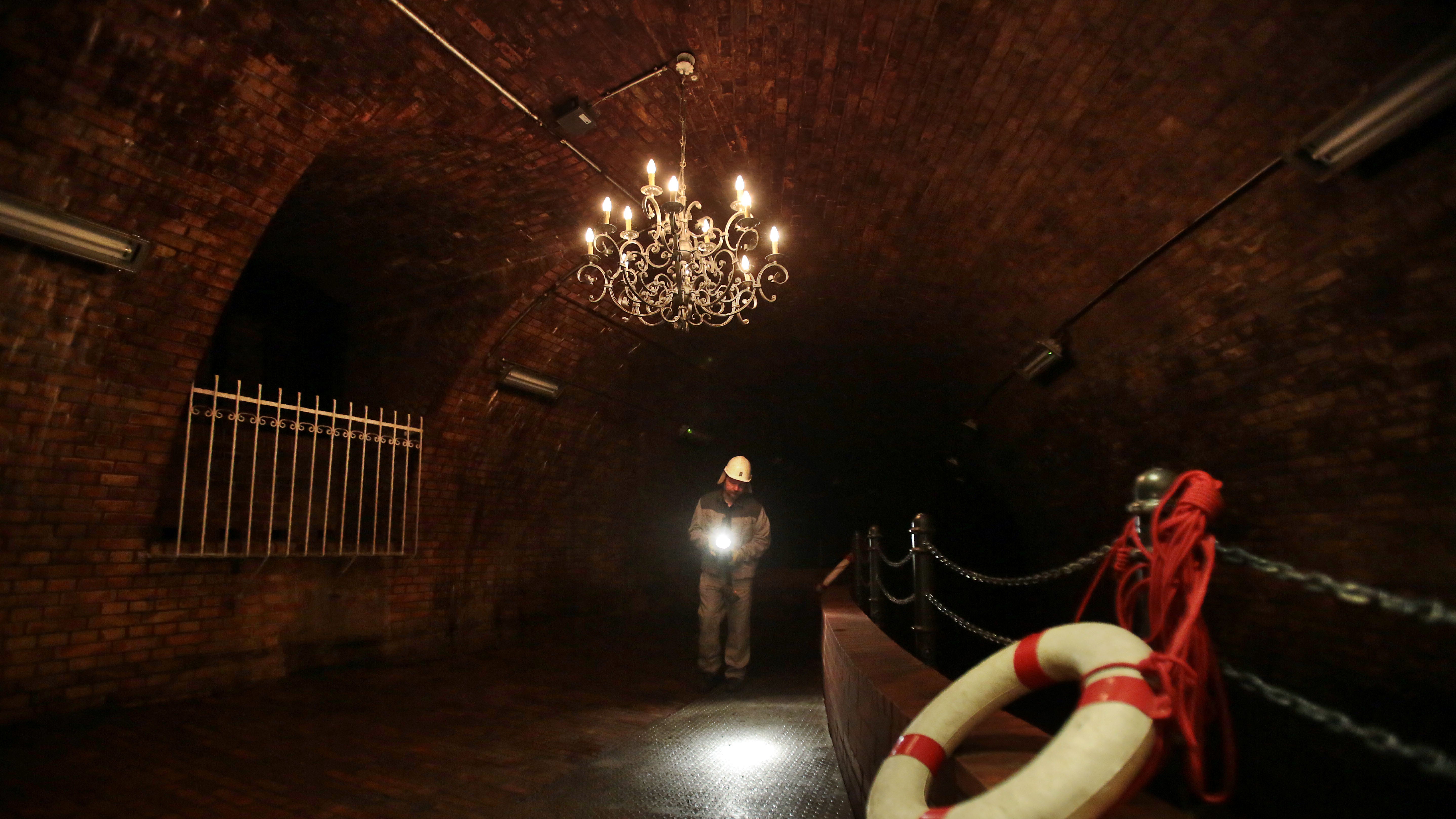 Nordrhein-Westfalen, Köln: Ein Mitarbeiter der Stadtentwässerungbetriebes geht am 28.05.2014 in Köln (Nordrhein-Westfalen) durch den Kronleuchtersaal in der Kölner Kanalisation. Zur Einweihung der Kanalisation 1890 wurde der Raum mit zwei Kronleuchtern ausgestattet, weil Kaiser Wilhelm II. eingeladen war. (Oliver Berg/dpa)