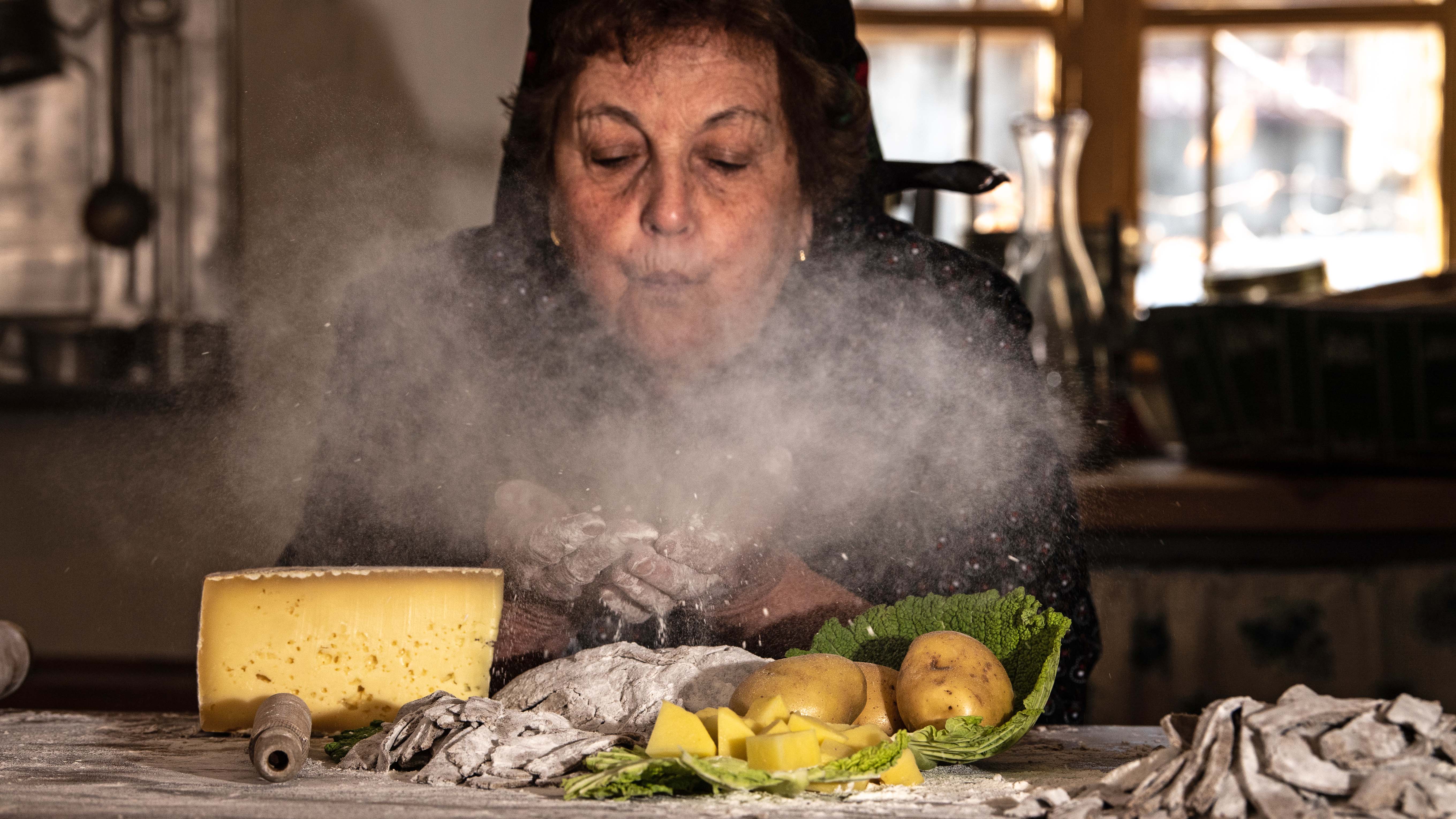Eine Frau aus Livigno stellt die lokale Spezialität Pizzoccheri her - aus Buchweizen, Käse und Kartoffeln
