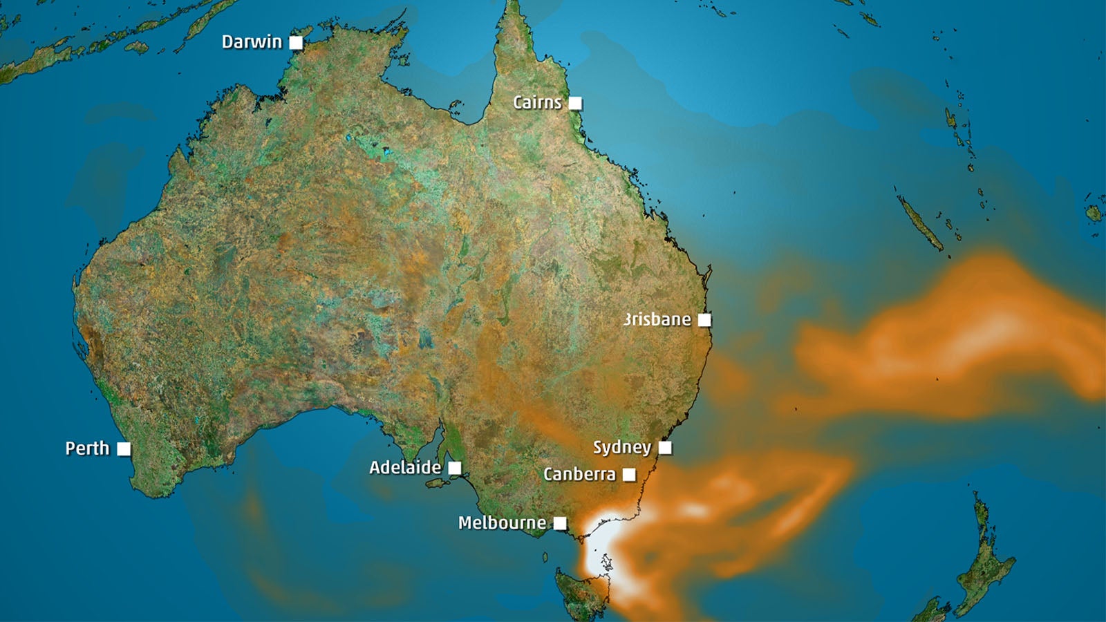 Die Rauchfahne der Buschbrände ist 11.000 Kilometer weit über den Pazifik bis nach Südamerika geweht