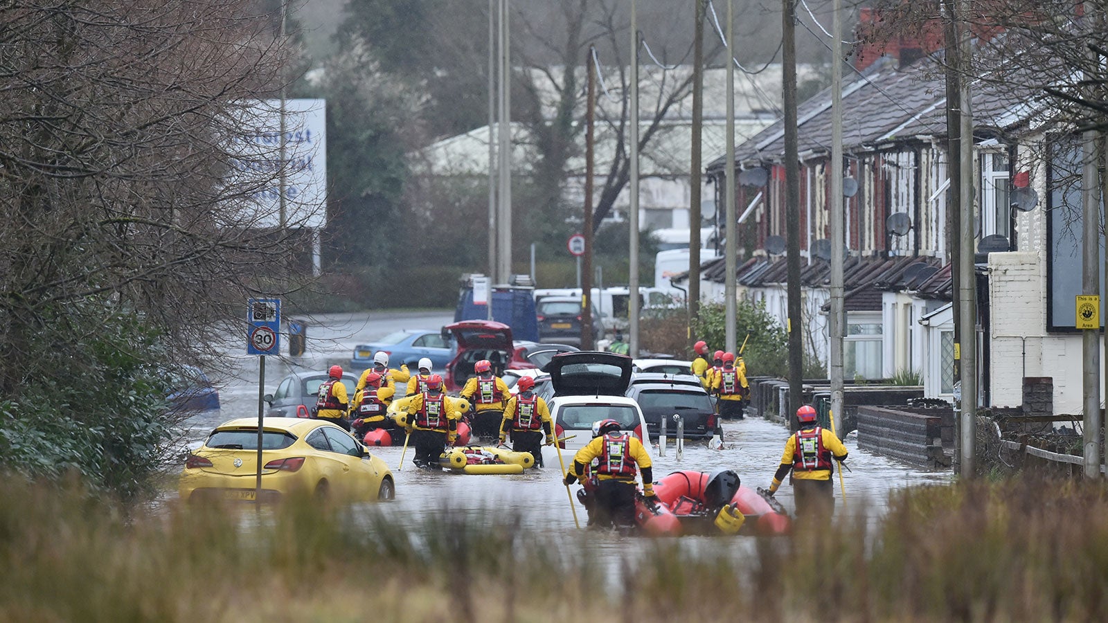 Rettungskräfte ziehen Schlauchboote auf der durch Sturm Dennis entstandenen Überschwemmungen in Nantgarw, England. Sturm Dennis hat das Hochwasser-Risiko stark erhöht. Die Behörden veröffentlichten Hunderte Warnungen vor Überschwemmungen.