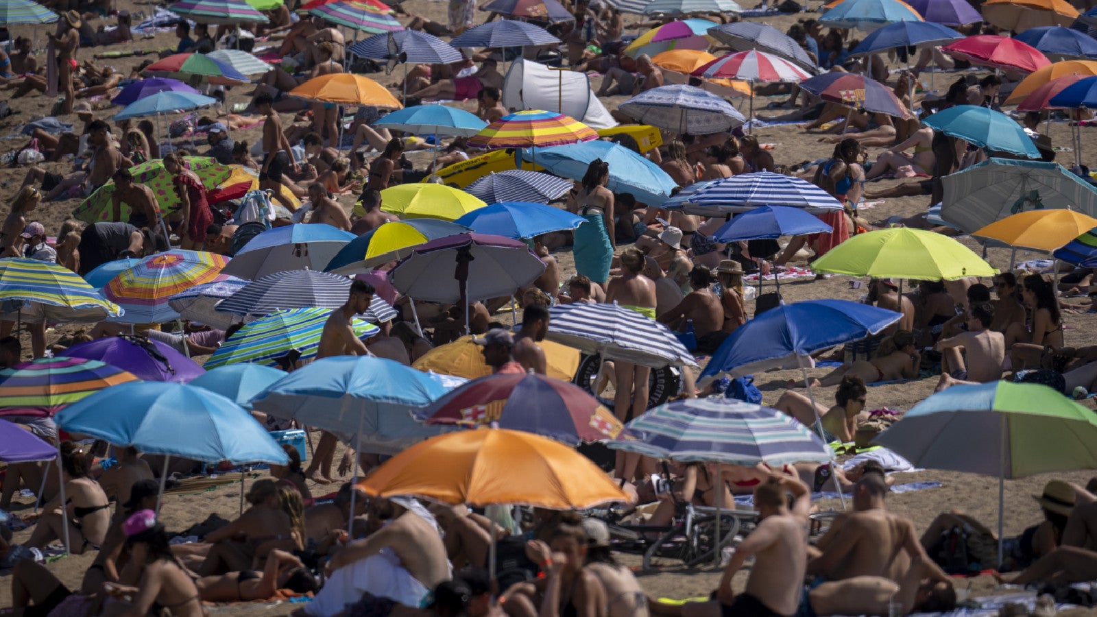 Spanien, Barcelona: Zahlreiche Menschen sitzen unter Sonnenschirmen am Strand. In Spanien galt am Freitag in 16 der 17 Autonomen Gemeinschaften Hitzealarm.
