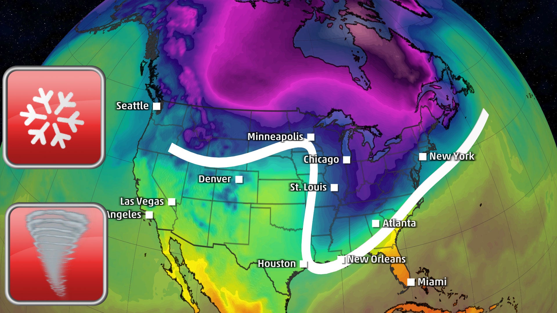 Der Sturm bringt einerseits extreme Kaltluft mit sich, und sorgt andererseits auch für starken Schneefall von den Plains bis nach Neuengland und Neufrankreich. Und in den Südstaaten droht ein Tornado-Outbreak, also eine Wetterlage, bei der immer wieder Tornados entlang einer Linie entstehen können. Es droht also extremes Unwetter.