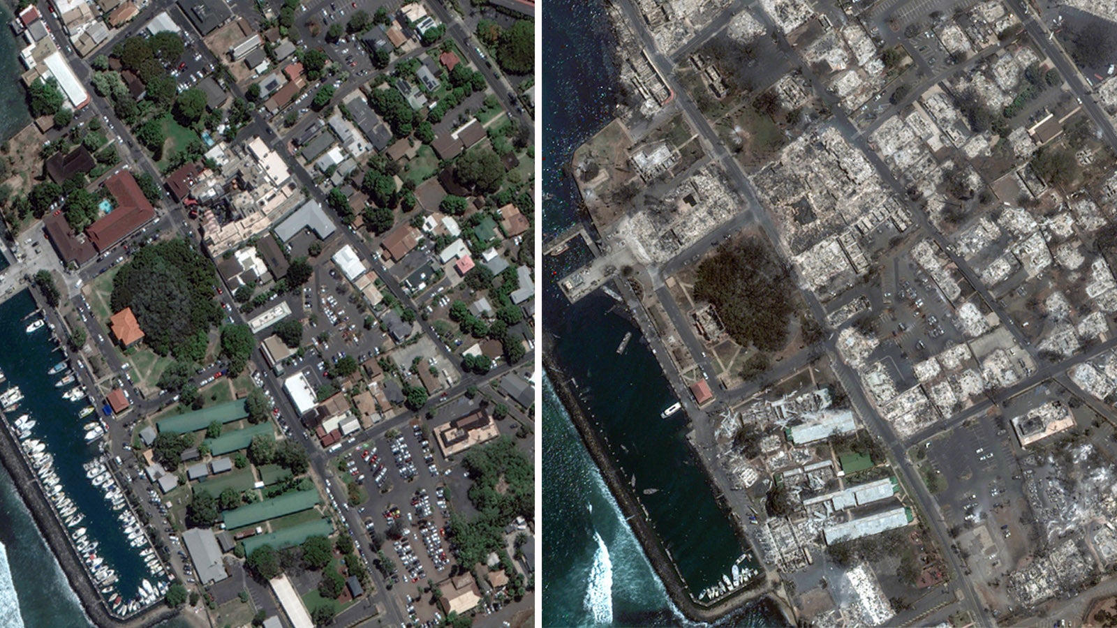 Diese Satellitenbilder, die von Maxar Technologies zur Verfügung gestellt wurden, zeigen einen Überblick über den Banyan Court in Lahaina auf Maui am 25. Juni 2023 (links) und über dasselbe Gebiet am 9. August 2023 (rechts). Die Flammen wüteten im Herz der hawaiianischen Insel.