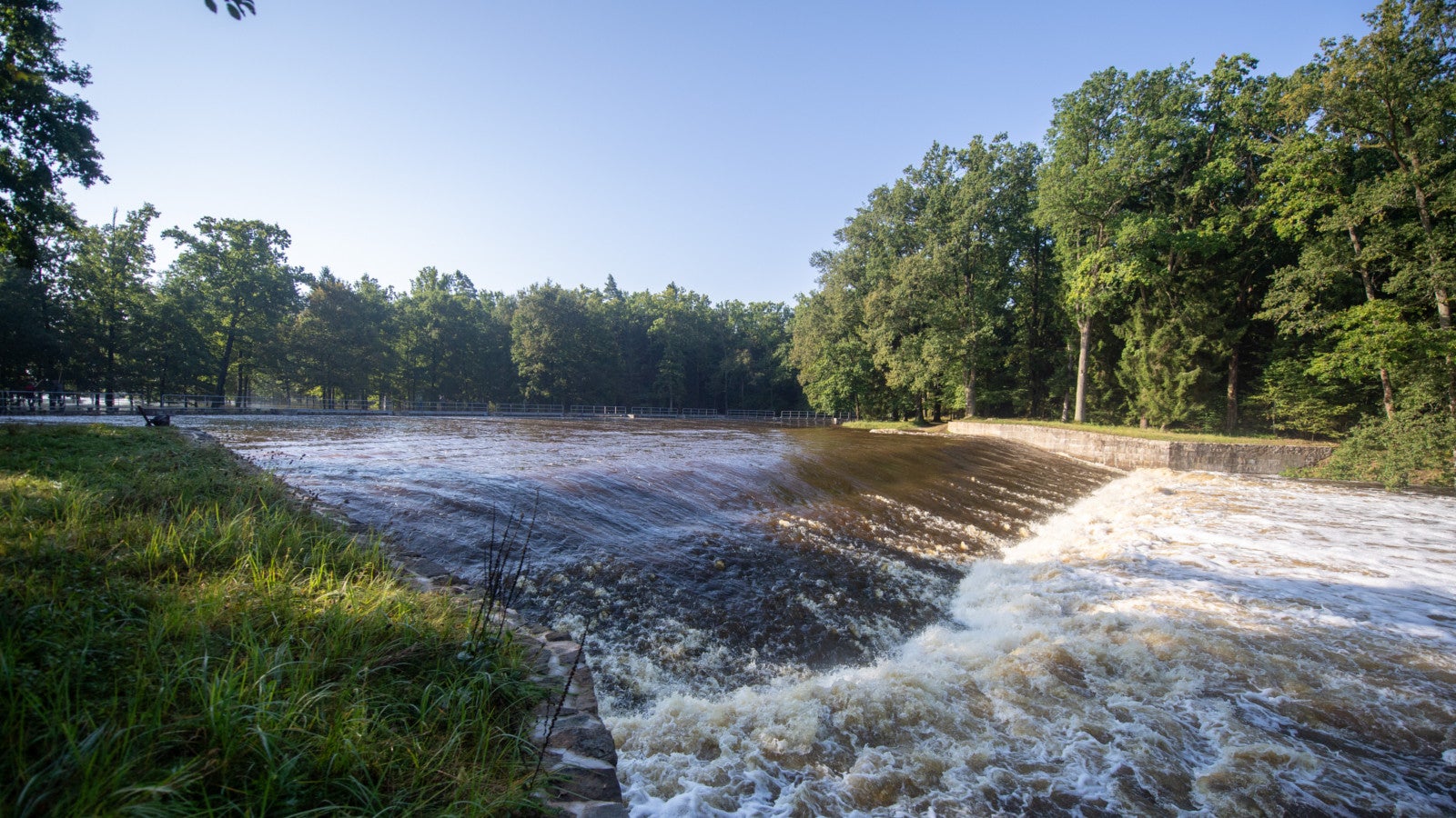 18.09.2024, Tschechien, Romberk: Wasser strömt durch den Romberker Teich, nachdem er nach einem Starkregenereignis übergelaufen ist.