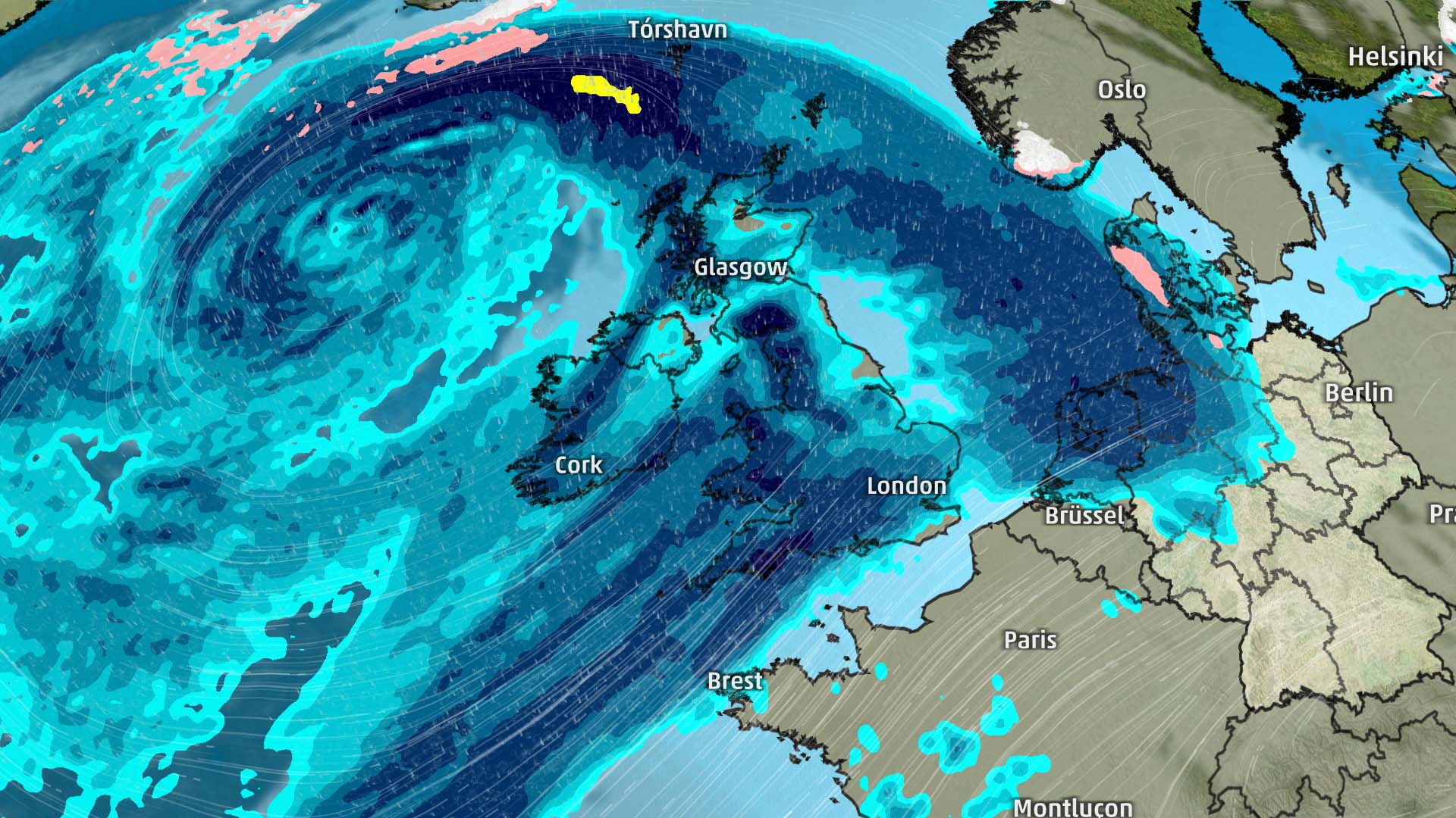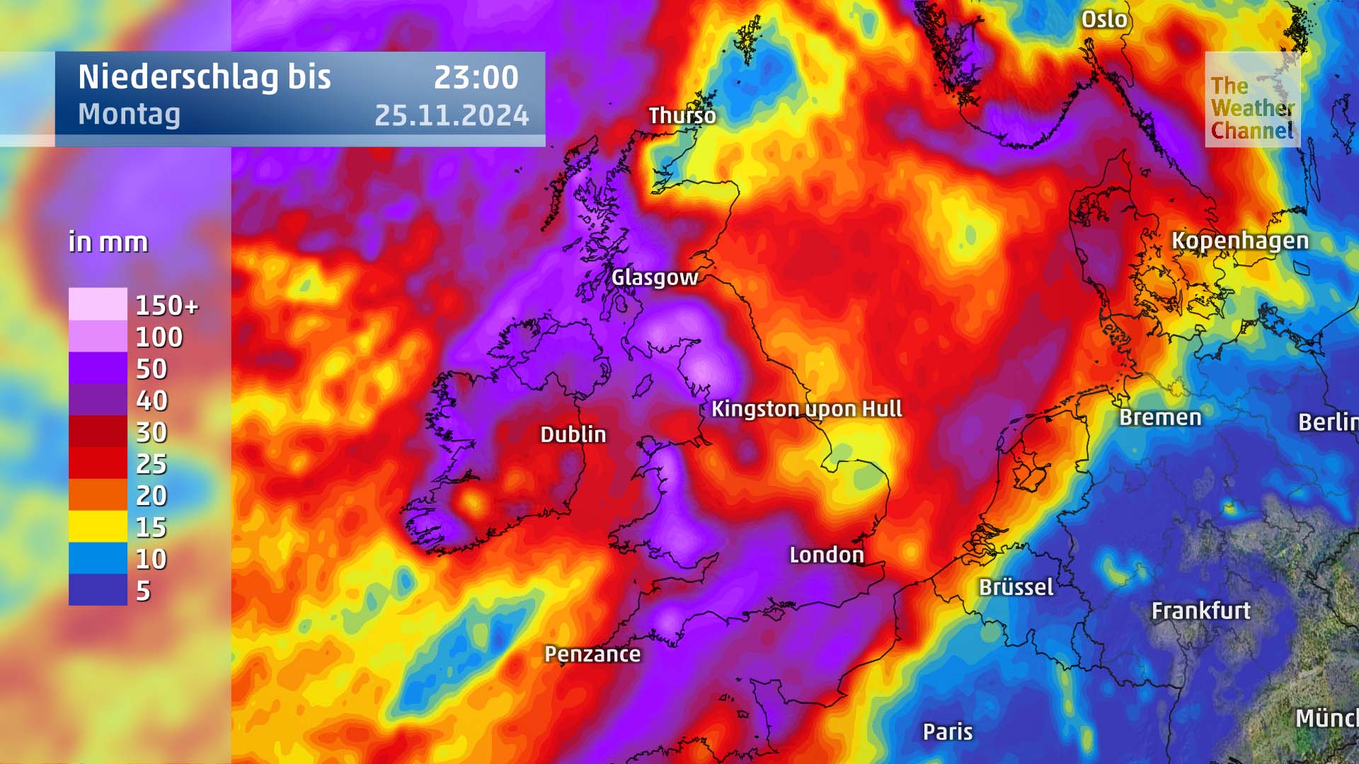 Die Regenmengen auf den Britischen Inseln sind ganz erheblich.