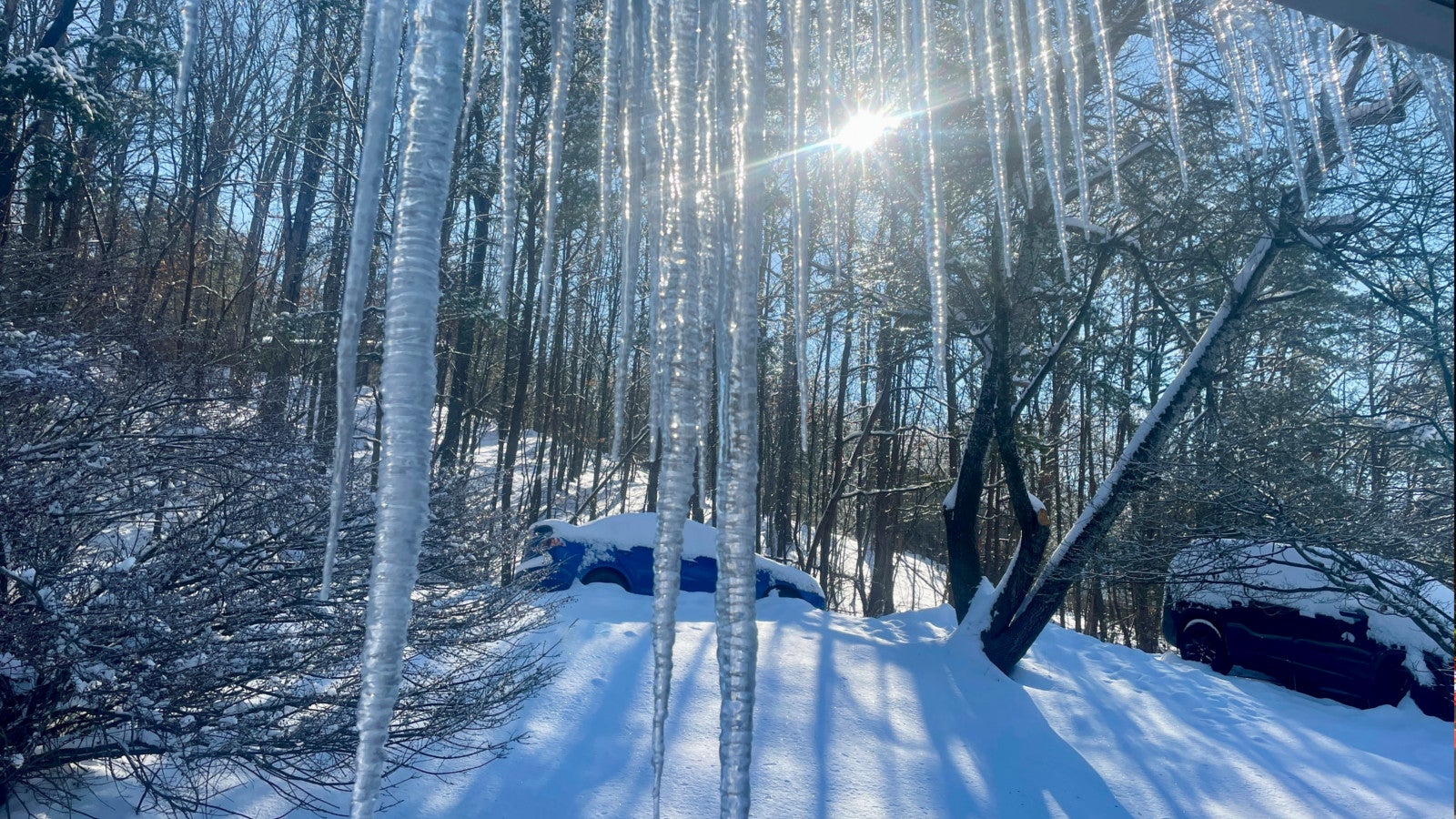 12.01.2025, USA, Cross Lanes: Eiszapfen sind an einem Haus zu sehen.