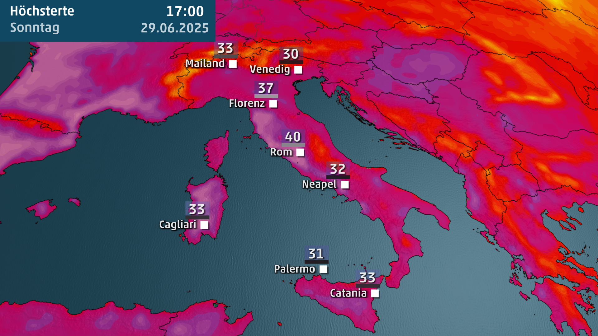In Rom und Florenz muss man in den kommenden Tagen mit 40 Grad oder mehr rechnen, während Mailand 35 Grad erwartet. Dort liegen die Höchstwerte aktuell um bis zu 12 Grad über dem klimatologischen Schnitt für Juni. Auch in Rom und Florenz ist es knapp 10 Grad zu heiß.