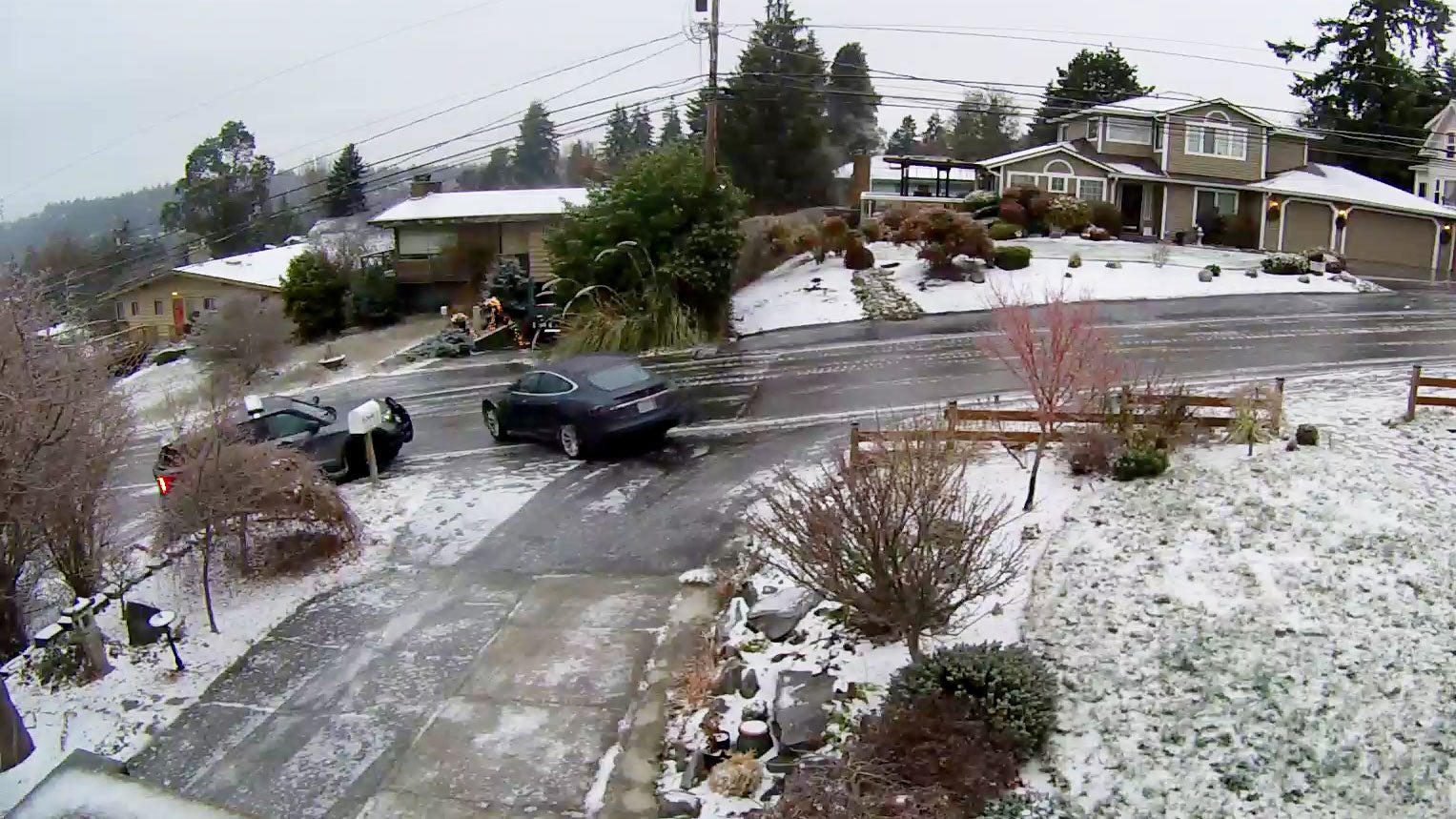 Dieser Fahrer aus Seattle stellte sein Auto am Straßenrand ab und dachte, alles sei in Ordnung. Sein Tesla geriet auf der vereisten Straße aber plötzlich ins Rutschen.