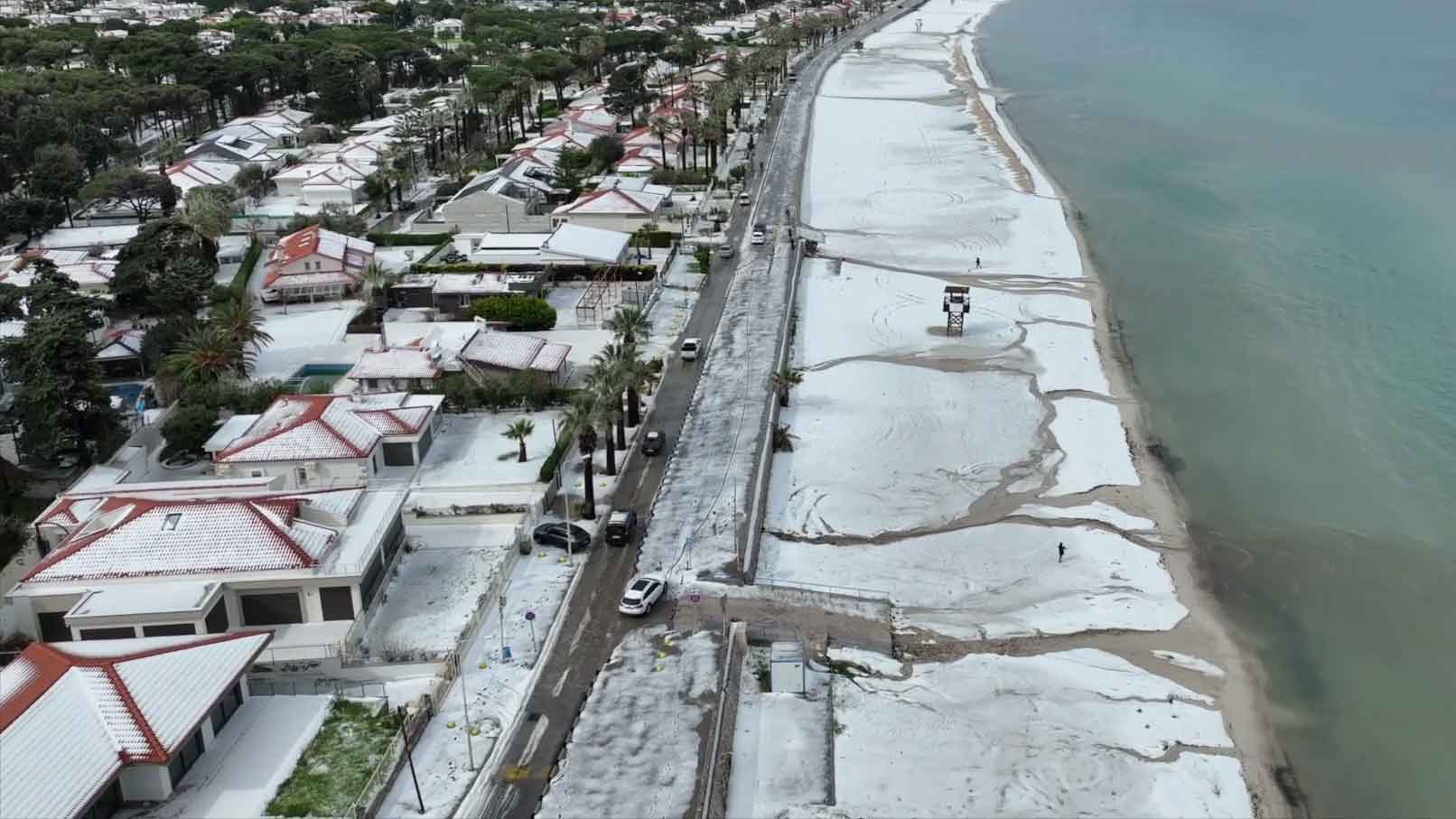 Das ist kein Schnee, der hier die Strände in Izmir überzieht - es ist Hagel.