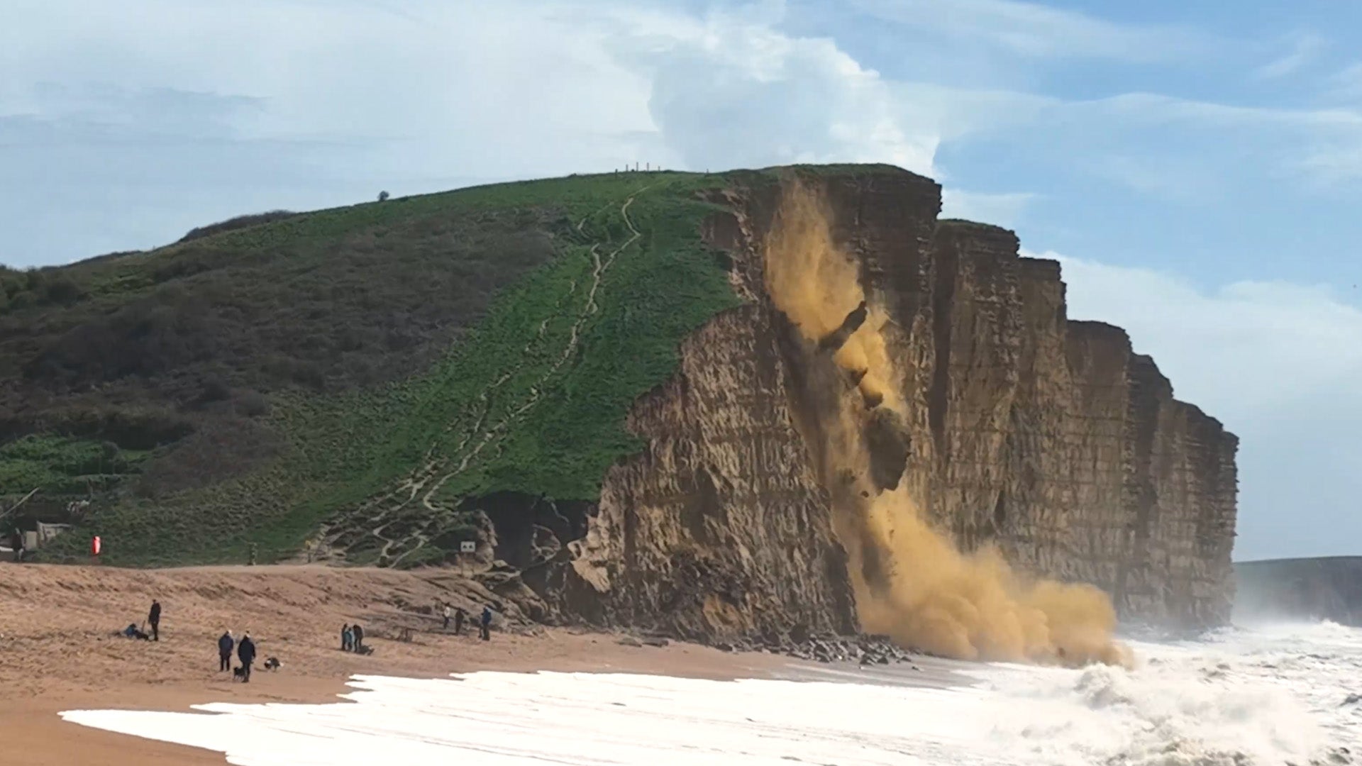 Ein Frühlingsspaziergang an der englischen Küste kann besondere Gefahren bergen. Standbesucher filmten diesen gewaltigen Felssturz an den Klippen des Ortes West Bay.