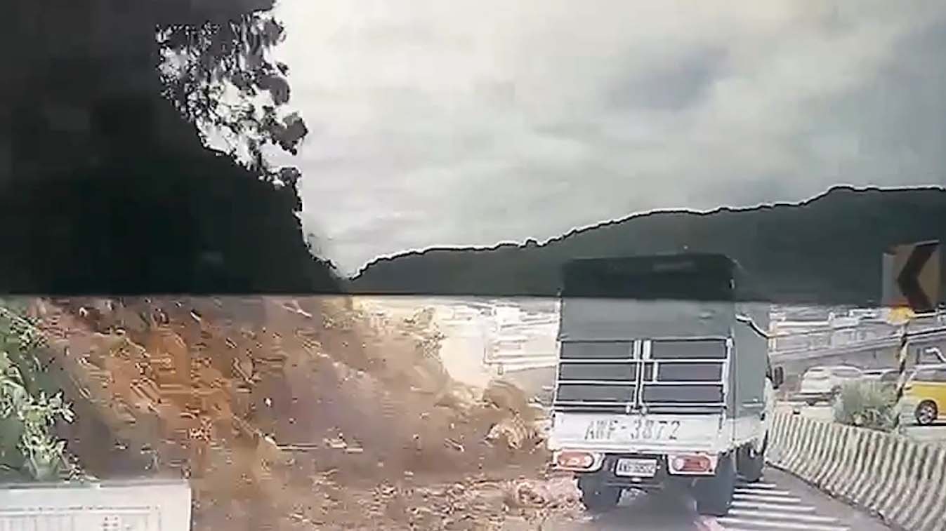 Ein massiver Erdrutsch in Taiwan verschluckt regelrecht einen Kleinlaster und begräbt das Fahrzeug und Steinen und Geröll.