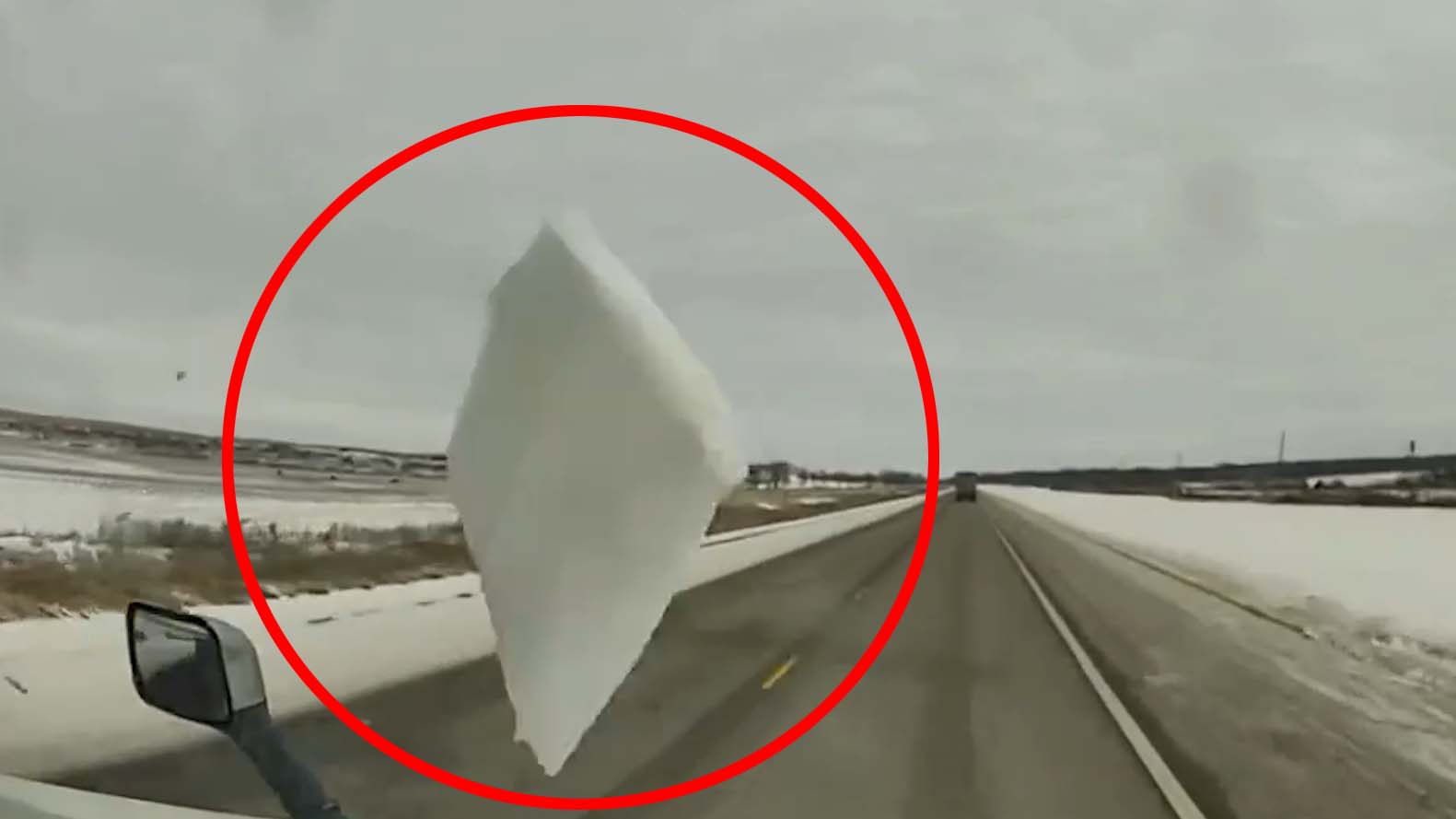 Ein mächtiger Eisblock löst sich auf der Schnellstraße von einem Fahrzeug und zertrümmert die Windschutzscheibe eines Lastwagens.