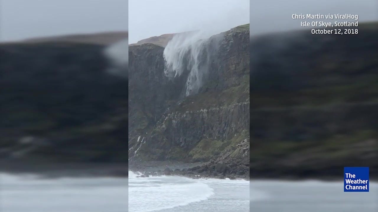 Auf der schottischen Insel Isle of Skye lieferten sich zwei Naturgewalten einen Kampf. Das Ergebnis ist ein spektakulärer Anblick. Für kurze Zeit fließt ein Wasserfall in die falsche Richtung