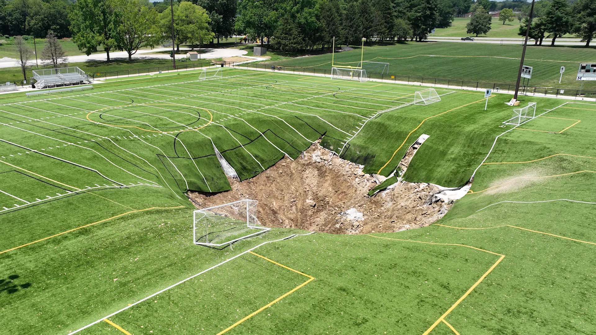 Ende Juni öffnete sich auf diesem Sportplatz im US-Staat Illinois plötzlich der Boden und ein riesiges Senkloch tat sich auf. Ein neues Drohnenvideo zeigt, wie massiv sich das Loch in nur zehn Tagen vergrößert hat. Der riesige Krater hat mittlerweile sogar damit begonnen, die Fußballtore an dem Sportplatz zu verschlucken.