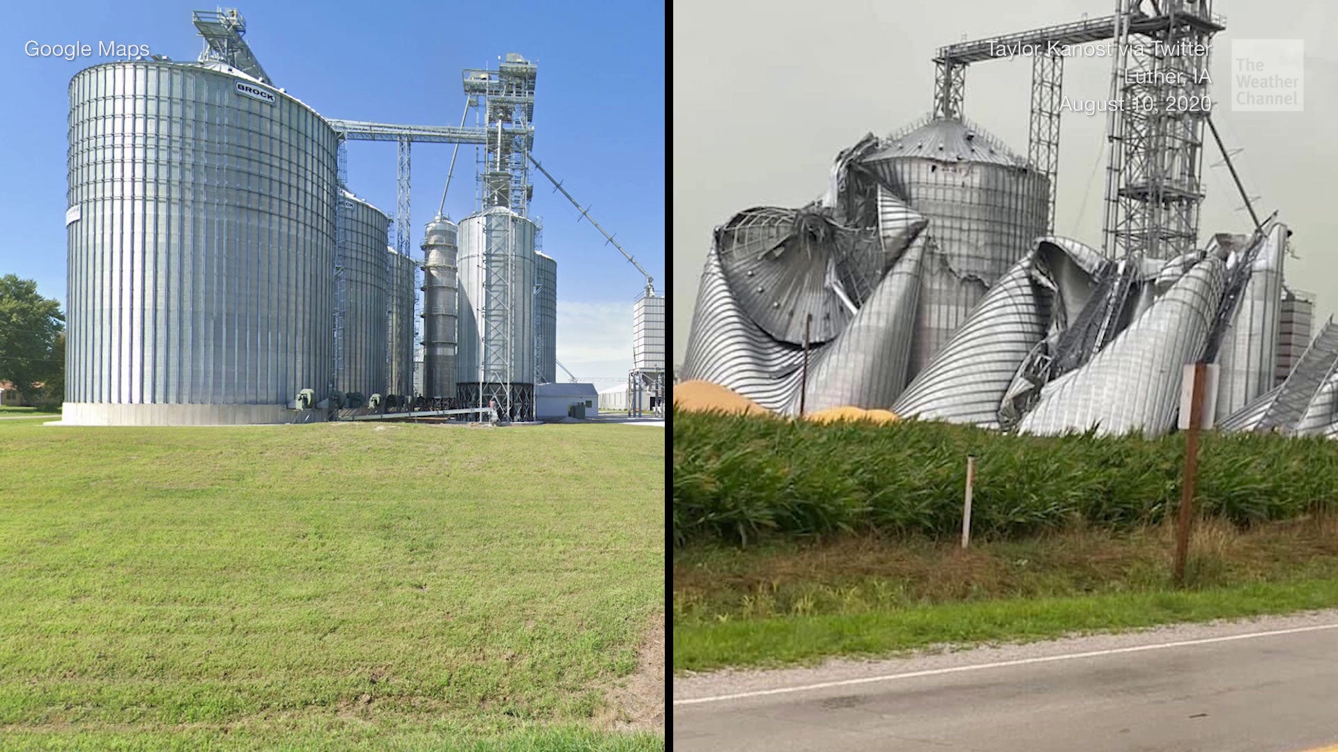 Vorher-Nachher-Bilder eines Getreidesilos in Iowa zeigen die schiere Kraft der Winde des Derecho-Sturms vom vergangenen Montag. Das Silo ist das größte Wahrzeichen der Kleinstadt Luther, etwa 50 Kilometer nördlich von Des Moines