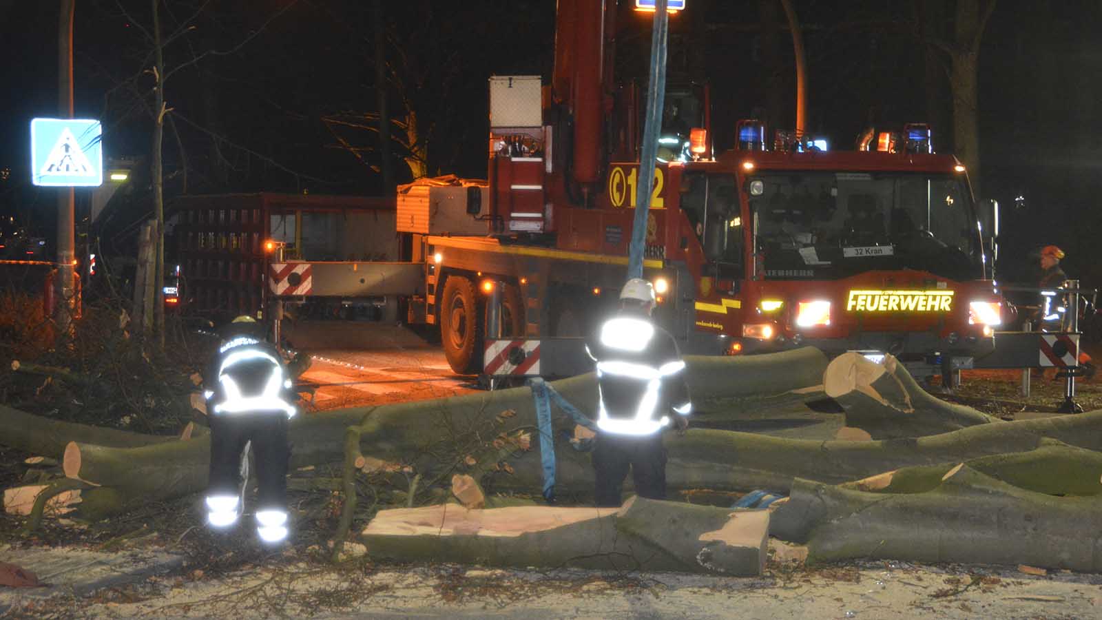 In Hamburg beseitigen Feuerwehrleute zwei umgefallene Bäume. Sie mussten mit einem Kran von der Straße gehoben werden.
