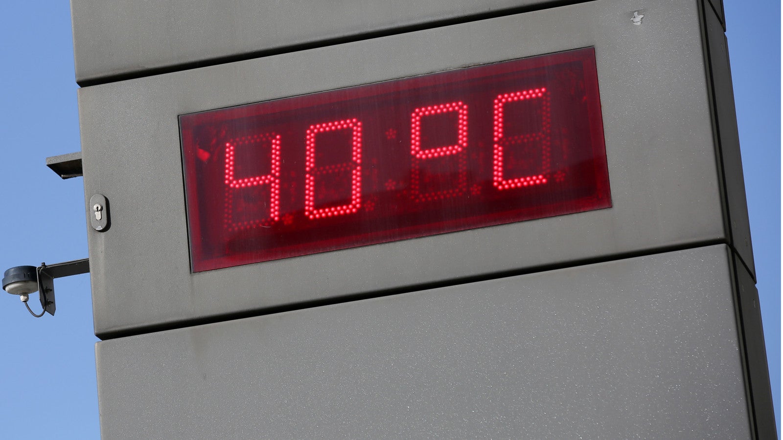 24.07.2019, Hamburg: Am S-Bahn-Eingang Jungfernstieg zeigt am Nachmittag bei Sonnenschein eine digitale Temperaturanzeige 40 Grad Celsius an.