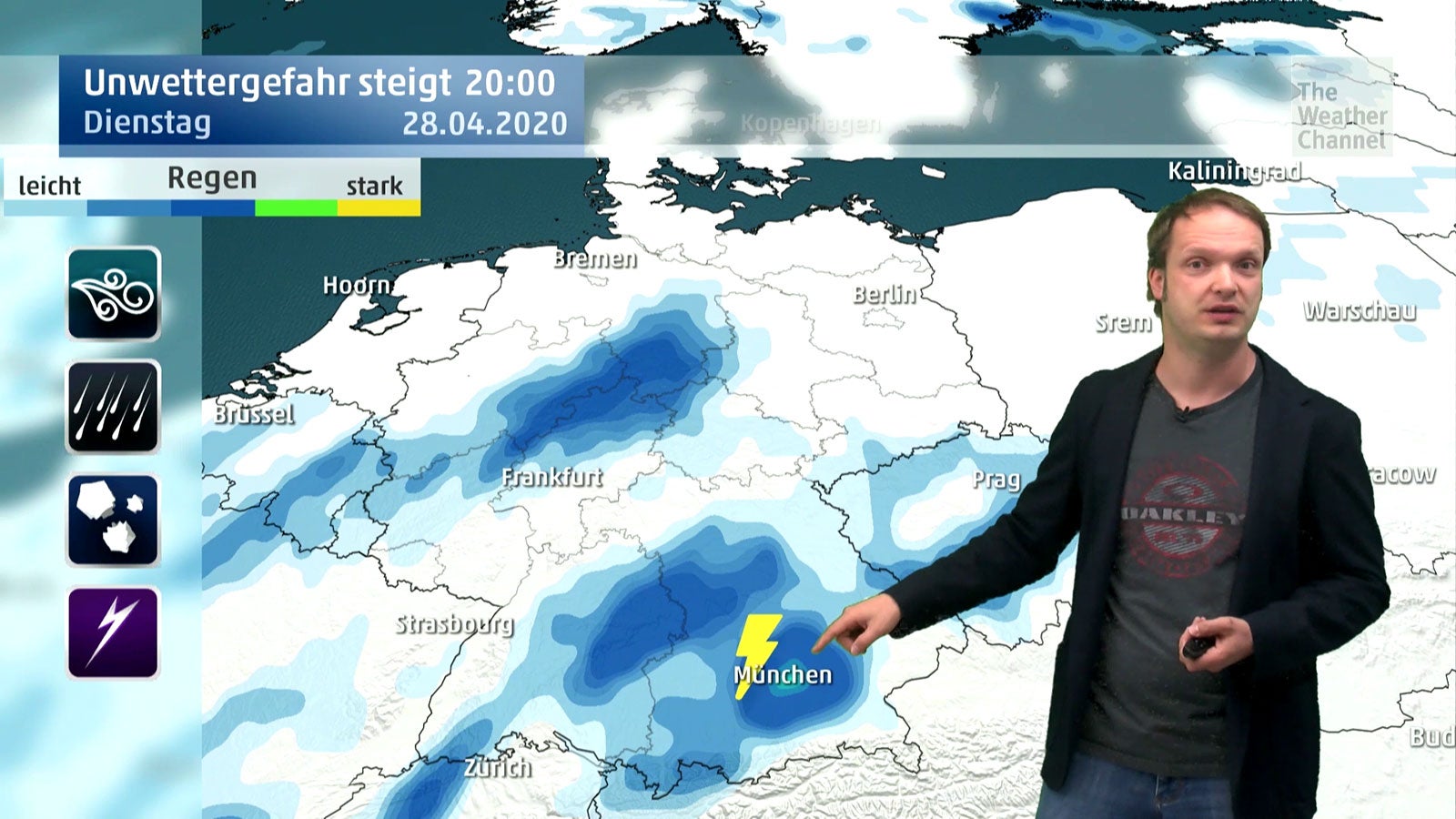 Im Süden - besonders südlich der Donau - sind auch schwere Gewitter möglich. Die Unwettergefahr steigt deutlich an. Jetzt kann es neben Starkregen auch zu schweren Gewitterböen und Hagel kommen. Die Gewitter werden sich wahrscheinlich auch bis tief in die Nacht halten können, ehe die Reste am Mittwochmorgen Deutschland in Richtung Tschechien oder Österreich verlassen.