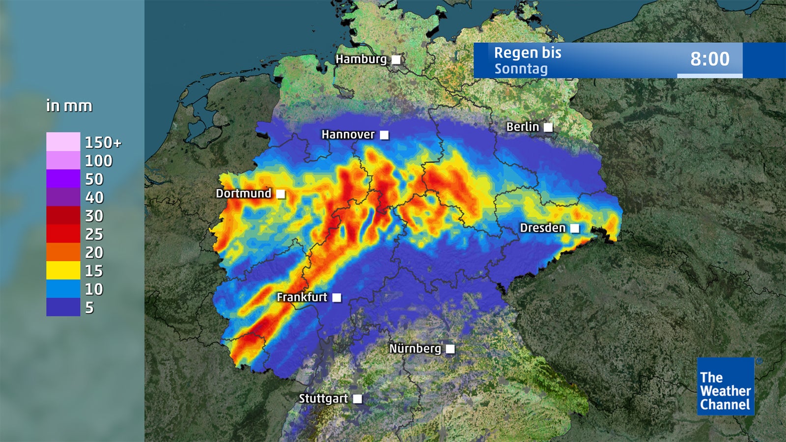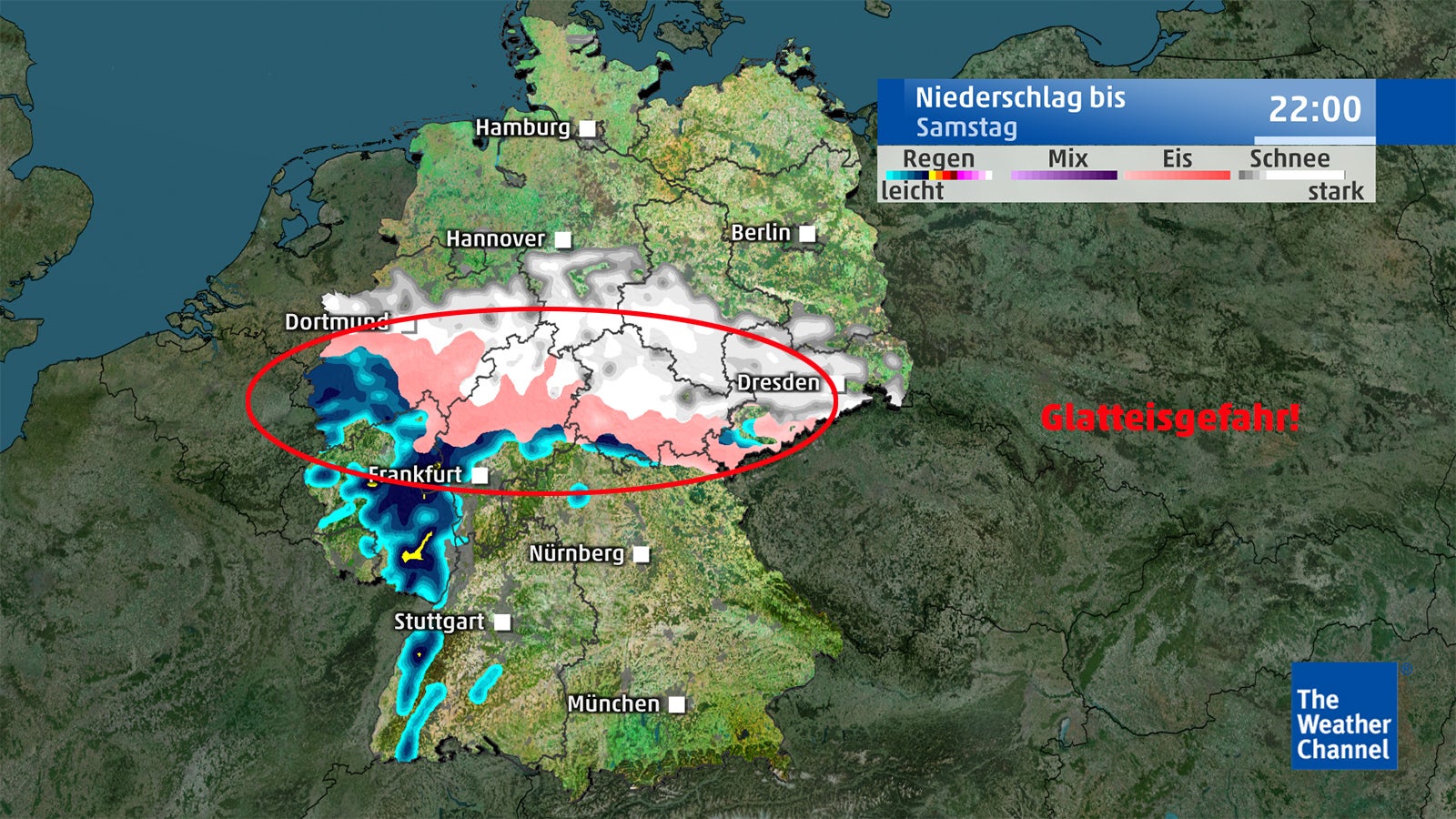 Besonders an der Luftmassengrenze zwischen Warm- und Kaltluft können die Auswirkungen des Niederschlags extrem werden. Hier drohen in einem Band vom Ruhrgebiet rüber bis nach Nordbayern und Thüringen extreme Wettergefahren. Da kann es besonders in der Nacht von Samstag auf Sonntag gefrierenden Regen geben. Dieser heftet sich an Bäumen, Strommasten und Stromleitungen an. Durch das zusätzliche Gewicht und den strammen Ostwind kann es dazu kommen, dass Äste abbrechen, Bäume und Masten umstürzen und Stromleitungen reißen. Zusätzlich droht Glatteisgefahr mit hohem Unfallpotenzial.