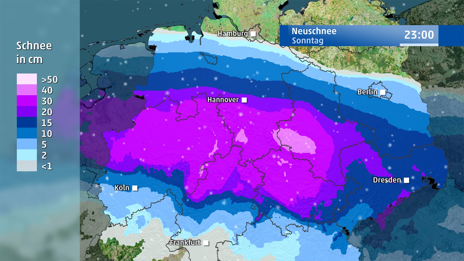 Aber auch in anderen Teilen Norddeutschlands und der Mitte Deutschlands kann es Schneefälle und eine geschlossene Schneedecke bis 25 Zentimeter geben, teilweise aber dann meist abschwächend auch über die Mainlinie hinweg. Bei strammem Wind kann es stellenweise auch zu Schneeverwehungen kommen. Die Küstenregionen, der äußerste Norden und auch der Süden Deutschlands bleiben voraussichtlich weitgehend schneefrei.