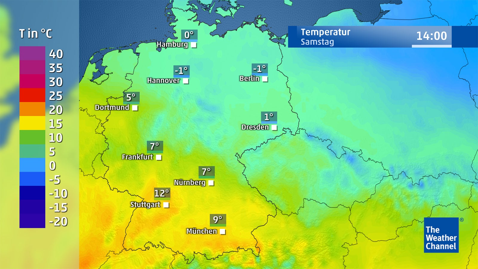 Dagegen spielt sich am Samstag das Kontrastprogramm im Süden Deutschlands ab. Während im Norden Dauerfrost mit Höchsttemperaturen von 0 bis minus 3 Grad herrscht, gibt es im Südwesten frühlingshaftes Wetter bei Temperaturen bis 15 Grad, im Süden Bayerns am Alpenrand in einigen Tälern bei Alpenföhn sogar bis 18 Grad. Am Sonntag schlägt der Frost im Norden und in der Nacht auch in der Mitte Deutschlands dann so richtig zu mit Höchstwerten von minus 4 bis minus 7 Grad, im Süden noch einmal bis 7 Grad, im Südwesten teils bis 13 Grad.