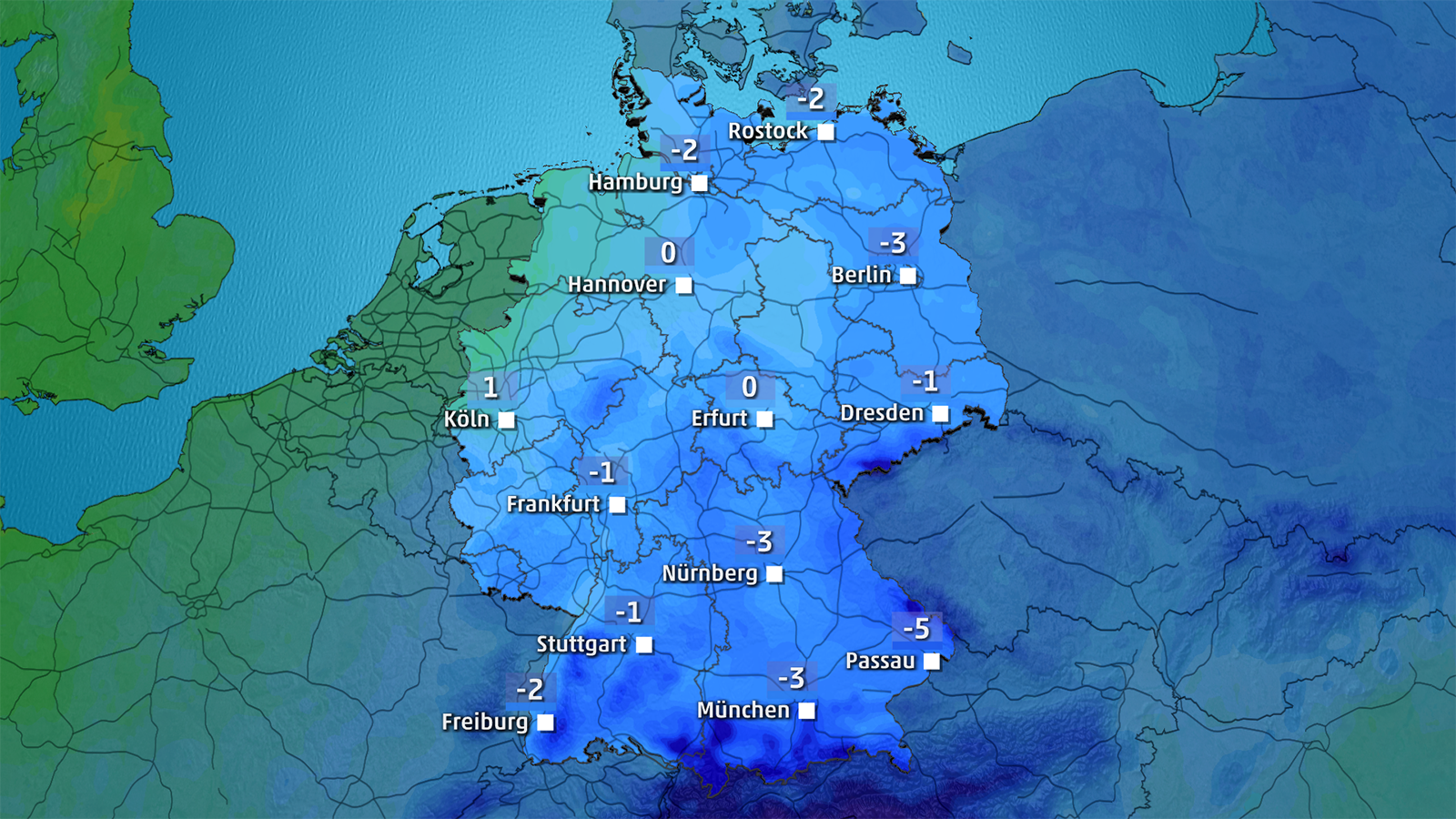Vom Nordosten Deutschlands breitet sich die kalte Luft in Richtung Süden aus. Auch am Boden sind die kalten Luftmassen zu spüren. Während die Temperaturen bis zum Donnerstag zwischen 3 und 10 Grad liegen, sinken die Werte am Freitag im Nordosten um 5 Grad. Weiter westlich kühlt es erst später ab und auch im Süden wird der kälteste Tag erst am Samstag erwartet. Dann liegen die Temperaturen dort zwischen 0 und 4 Grad.