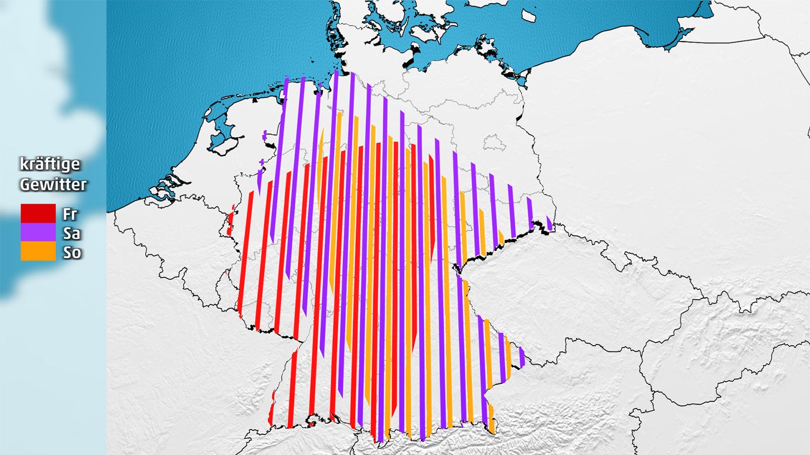 Aber auch der Wind ist ein Thema, denn in der Nähe kräftiger Unwetter frischt er stark auf und erreicht in Böen teils auch volle Sturmstärke.