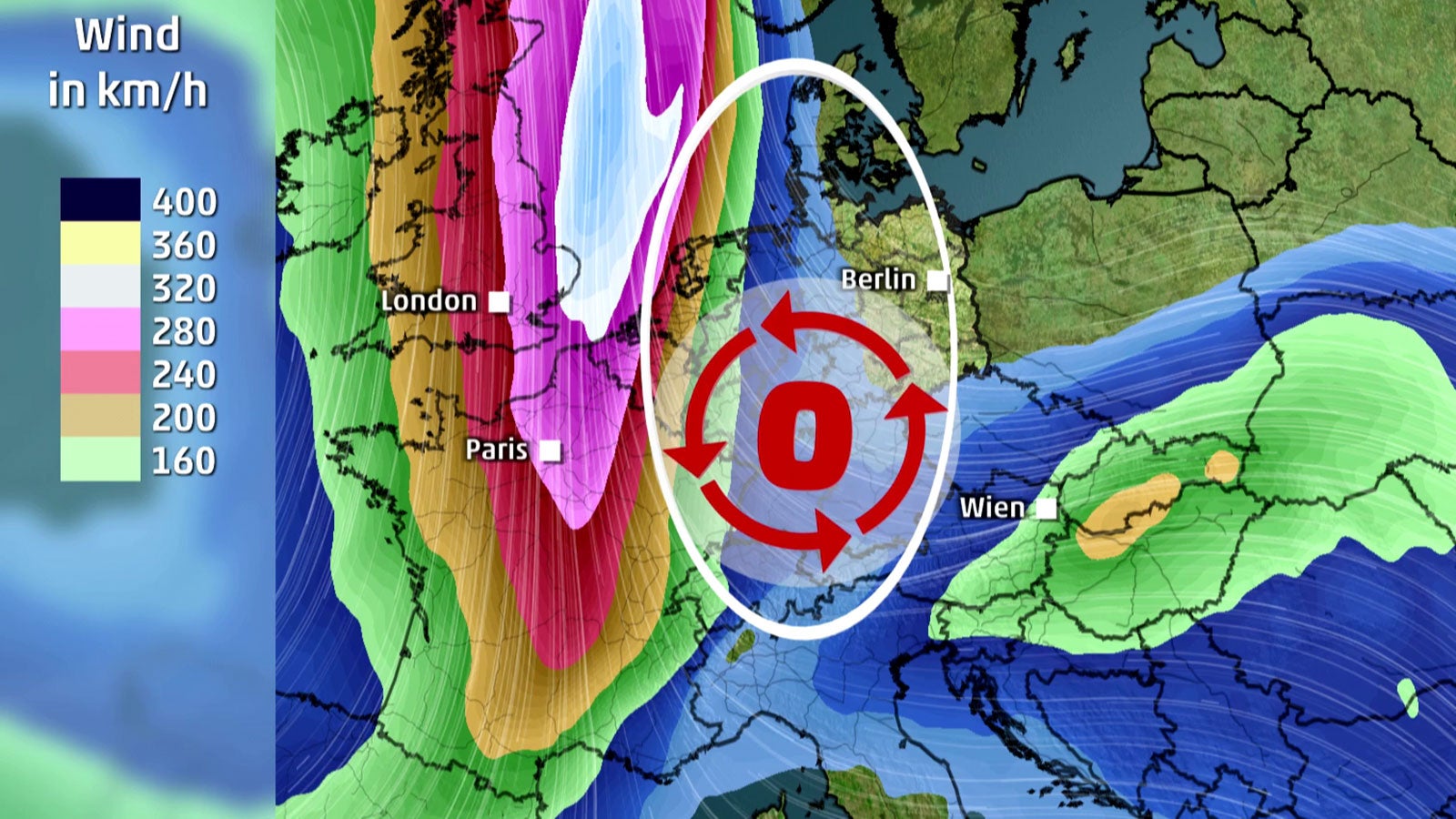 Von Montag auf Dienstag schlägt der Jet dann voll zu. Er weht direkt aus Norden, mit Spitzenwerten von bis zu 340 km/h in der Höhe. Immer wenn sowas passiert, dann werden Meteorologen nervös. Denn bei solchen Höhenwinden kann sich ein schwerer Sturm entwickeln - oder gar ein Orkan. Es kann zu extrem schnellen Entwicklungen kommen. Und auch, wenn das Wetter noch sehr dynamisch ist und sich noch viel ändern kann, so sollte man das Wetter am Montag genau im Auge behalten.