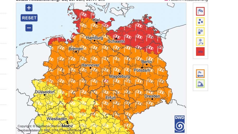 Der Deutsche Wetterdienst (DWD) hat eine Unwetterwarnung der Stufe 3 für die gesamte norddeutsche Küste herausgegeben. Von Samstag, 14 Uhr, bis voraussichtlich Sonntag, 10 Uhr, können in Schleswig-Holstein, Mecklenburg-Vorpommern und Niedersachsen orkanartige Böen mit Geschwindigkeiten von bis zu 110 Kilometern pro Stunde auftreten.