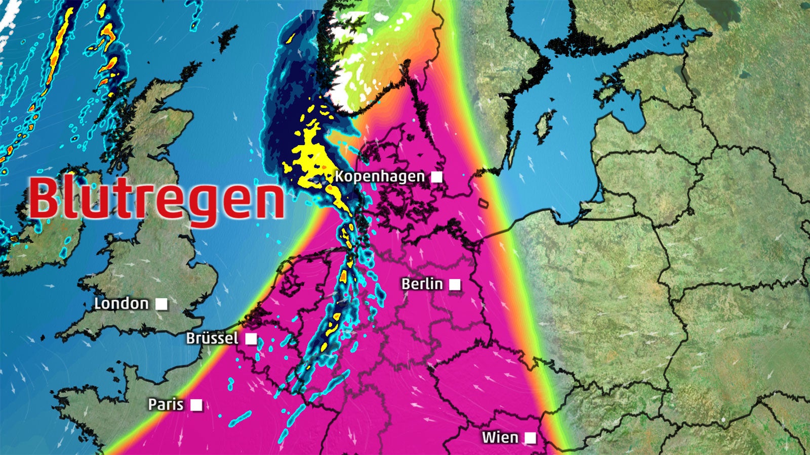 Die Wolke aus Sahara-Staub über Europa ist noch nicht weg. Am Mittwoch breitet sie sich bis nach Dänemark aus. Am Donnerstag kommt dann auch noch neuer Regen dazu. Das bedeutet, dass am Donnerstag auch wieder neuer Blutregen bevorsteht. Und diesmal trifft es das ganze Land - also auch Köln, Düsseldorf, Hamburg, Flensburg und Berlin.