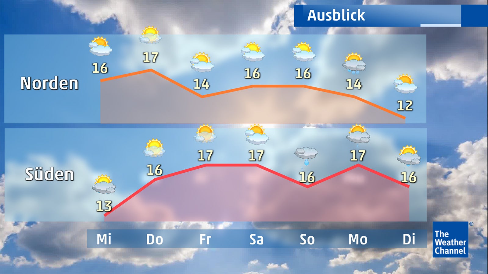 Lediglich im Osten verbleiben noch ein paar Wolken am Himmel und trüben den Sonnenschein etwas. Die Temperaturspanne umfasst 11 Grad an der Nordseeküste und bis zu 20 Grad entlang des Rheins.