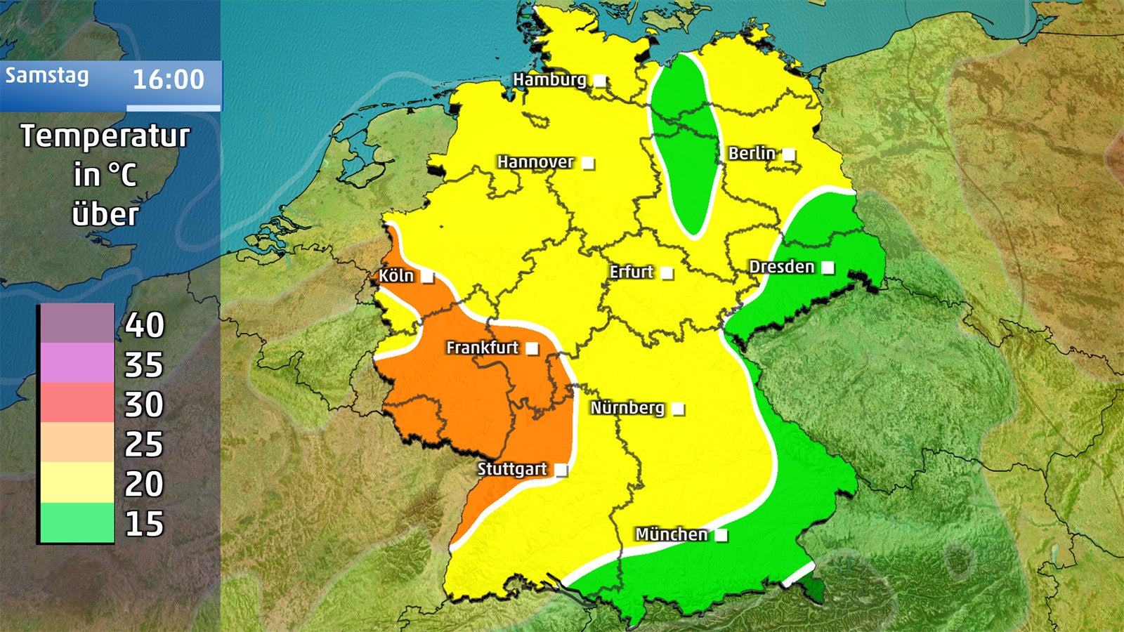 Dabei werden im Norden und in der Westhälfte 23 bis 26 Grad erreicht, im Rhein-Main-Gebiet weiterhin heiße 30 Grad – hier geht der trocken-heiße Hochsommer ohne Unterbrechung weiter, mit bedrohlichen Auswirkungen auf die Natur. In der Osthälfte und im Süden ist es unter Wolken mit 17 bis 21 Grad kühler.