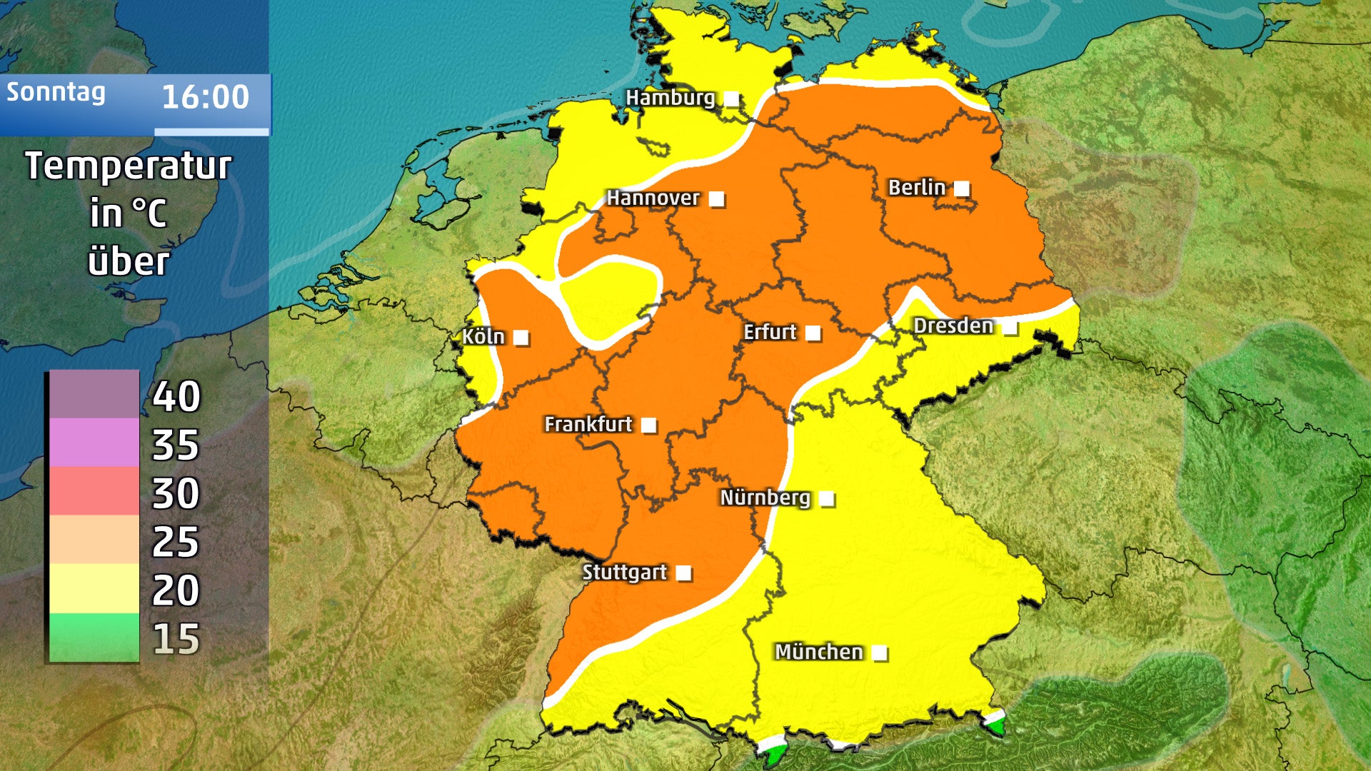 Der Sonntag präsentiert sich dann auch im Süden und Osten freundlich bei verbreitet harmlosen Wolken und Sonnenschein. Nur in der Lausitz, in Niederbayern und in Friesland sind dichtere Wolkenfelder und einzelne Schauer möglich. Im Westen verdichten sich zum Abend die Wolken, es bleibt aber überwiegend trocken. Das Thermometer zeigt sommerliche Werte zwischen 23 und 26 Grad an, im Rhein-Main Gebiet und im Rhein-Neckarraum sind hochsommerliche 30 Grad dabei.