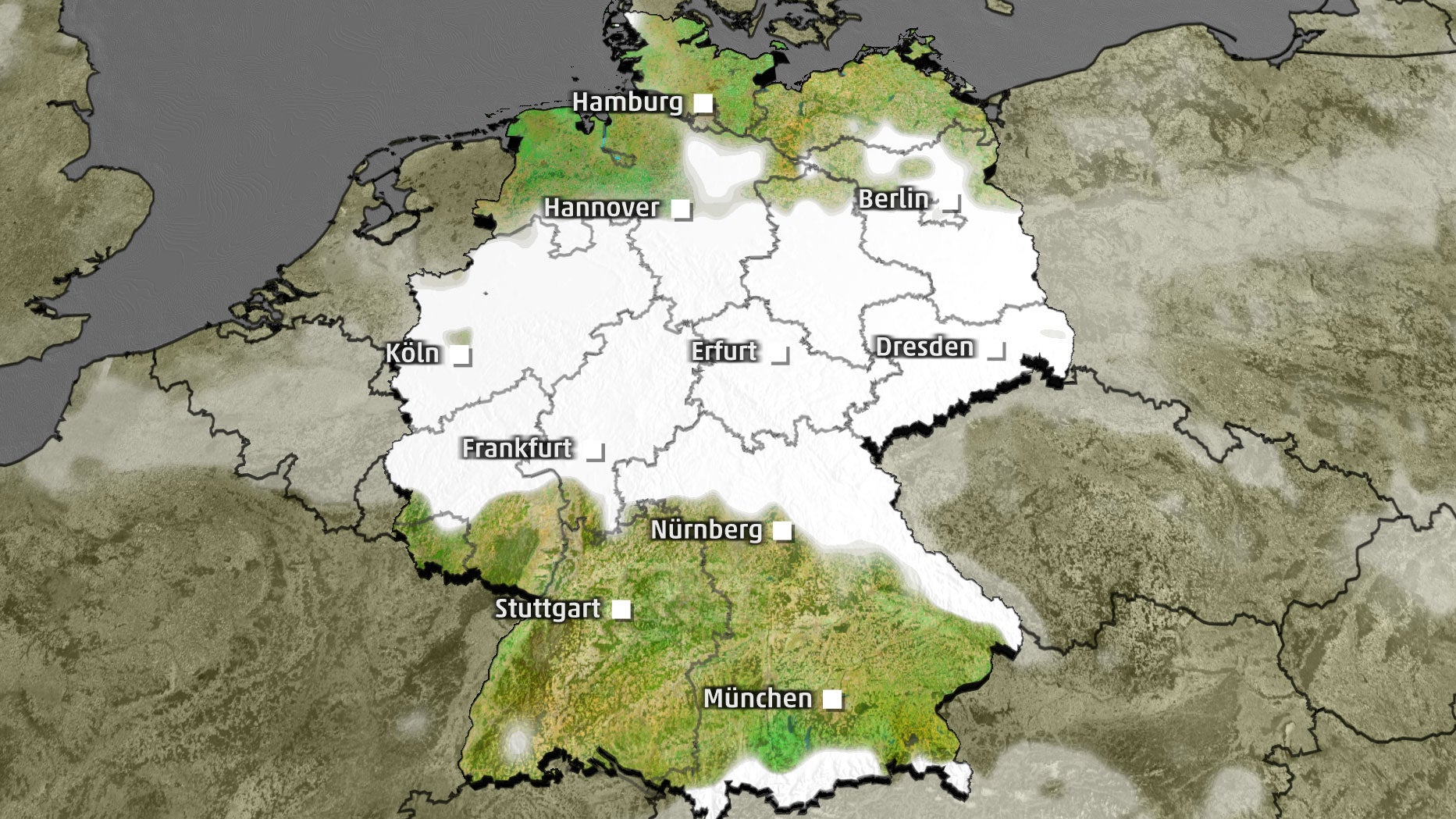 Tief Diethelm nimmt die Schneefront auf. Es bildet sich am Mittwoch eine gefährliche Gegenstromlage, wenn der Tiefdruckkern durch den Süden Deutschlands zieht. Die Kaltluft aus Norden wird gegen die Warmluft aus Süden gedrückt. Es kommt zu starken Schneefällen über der Mitte Deutschlands. Am Mittwoch sind Schneemengen von mehr als 10 Zentimetern in 24 Stunden möglich. Im Süden regnet es kräftig. Sowohl im Regen als auch im Schneefall droht Unwetter-Alarm.