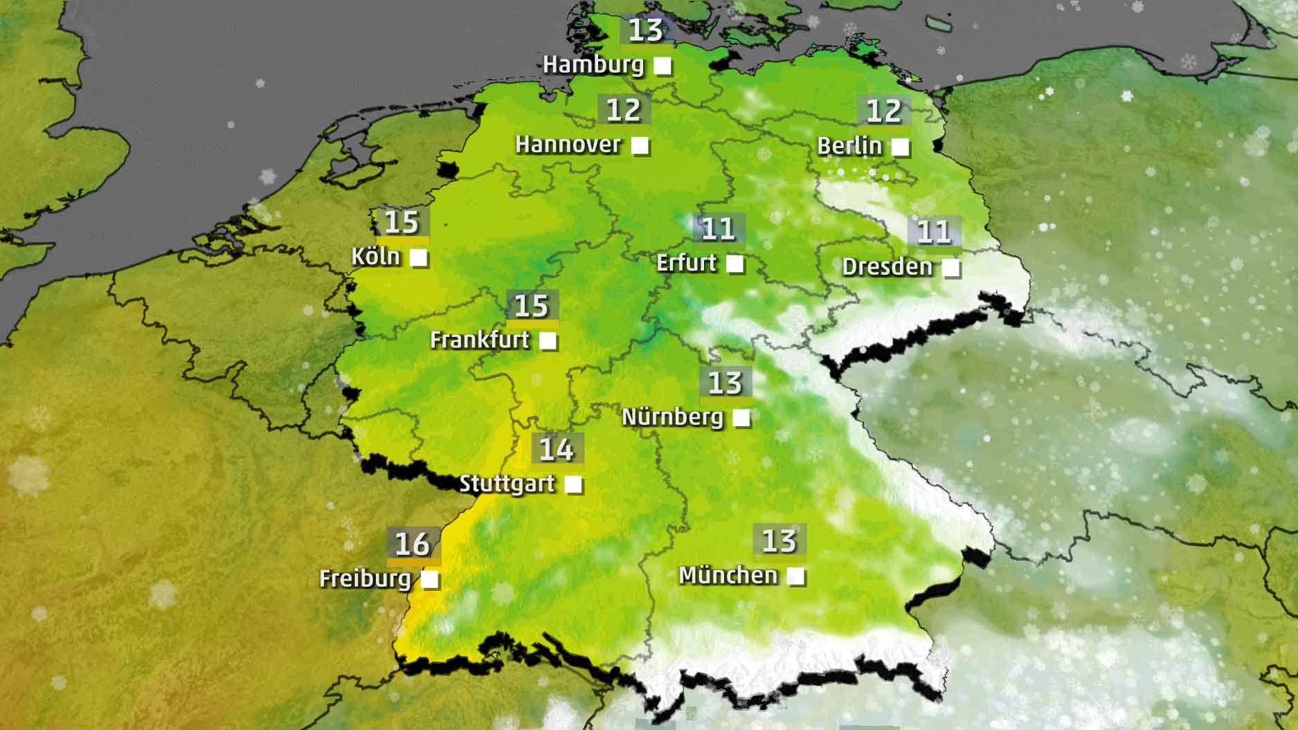 Auch über Schnee an Ostern müssen wir sprechen. Anfang der Karwoche schneit es fast im ganzen Land. Gegen Ende der Karwoche gibt es Schneesignale im Osten. Und das heißt, dass es am Erzgebirge in Sachsen tatsächlich weiße Ostern geben könnte. Noch ist das natürlich keine valide Vorhersage. Aber wenn es irgendwo weiß wird an Ostern, dann wohl im östlichen Teil des Erzgebirges.