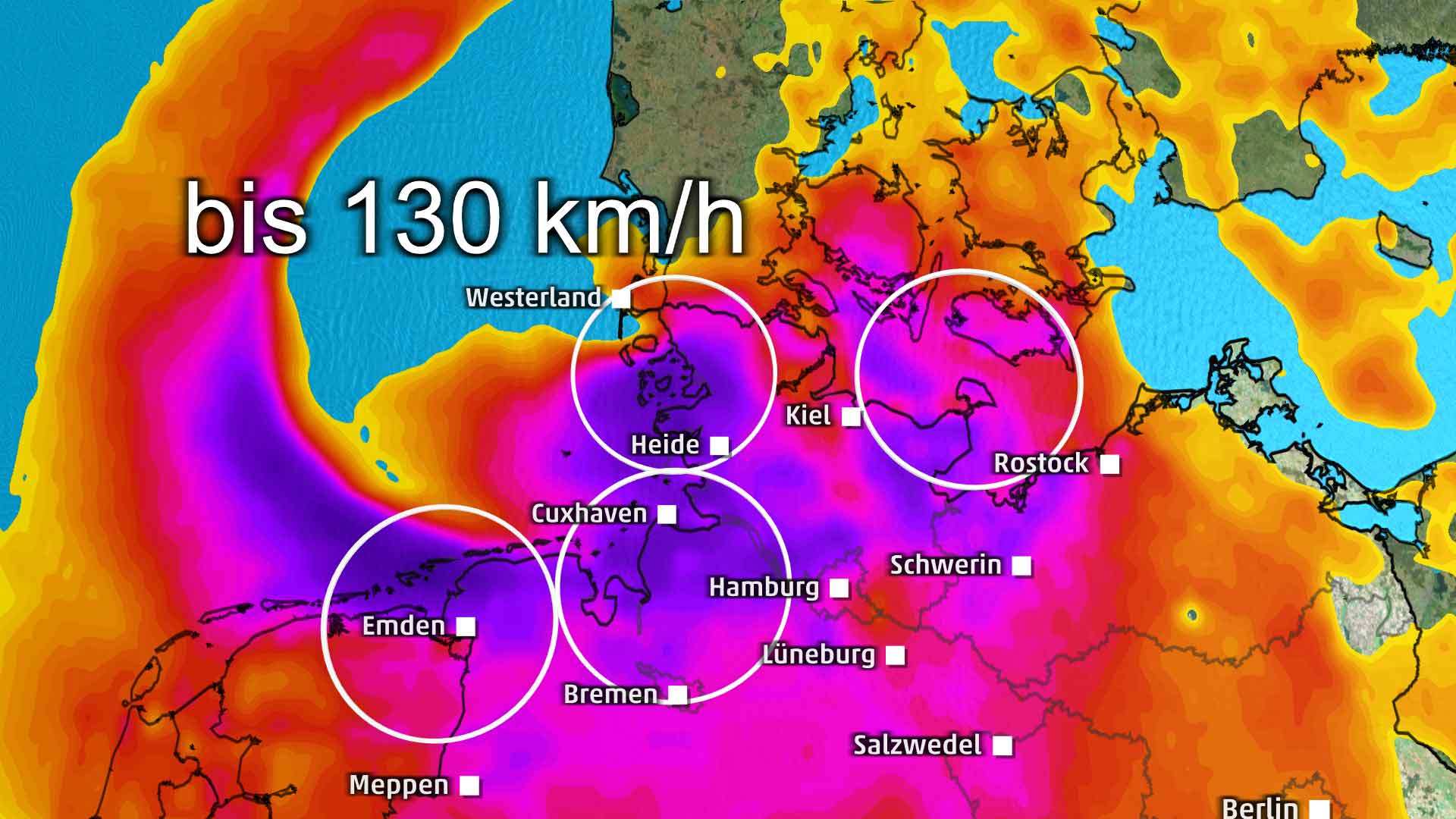 Es bildet sich ein Sturmfeld, das ungefähr von Köln bis Erfurt und Rügen reicht. Es kommt verbreitet zu Sturmböen bis 80 km/h und vereinzelt auch zu schweren Sturmböen bis 100 km/h. Am Abend sind auch orkanartige Böen im Umfeld der Ostsee möglich.
