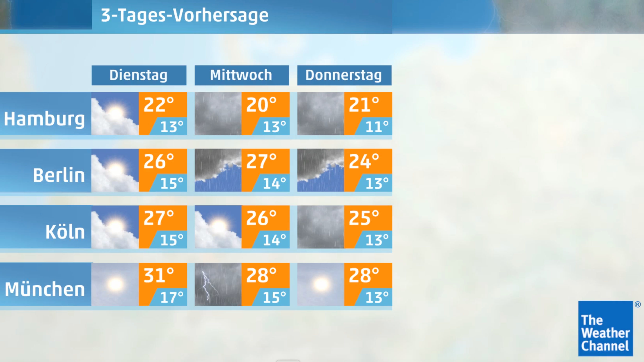 Zudem steigt das Gewitterrisiko in den nördlichen Landesteilen und vor allem in Bayern. Auch ansonsten wird der Sonnenschein immer wieder von Wolken getrübt. Die Tageshöchstwerte liegen zwischen 20 Grad an der Nordseeküste sowie im Rothaargebirge und 31 Grad in den Bayerischen Donauniederungen, in Sachsen und am Oberrhein.