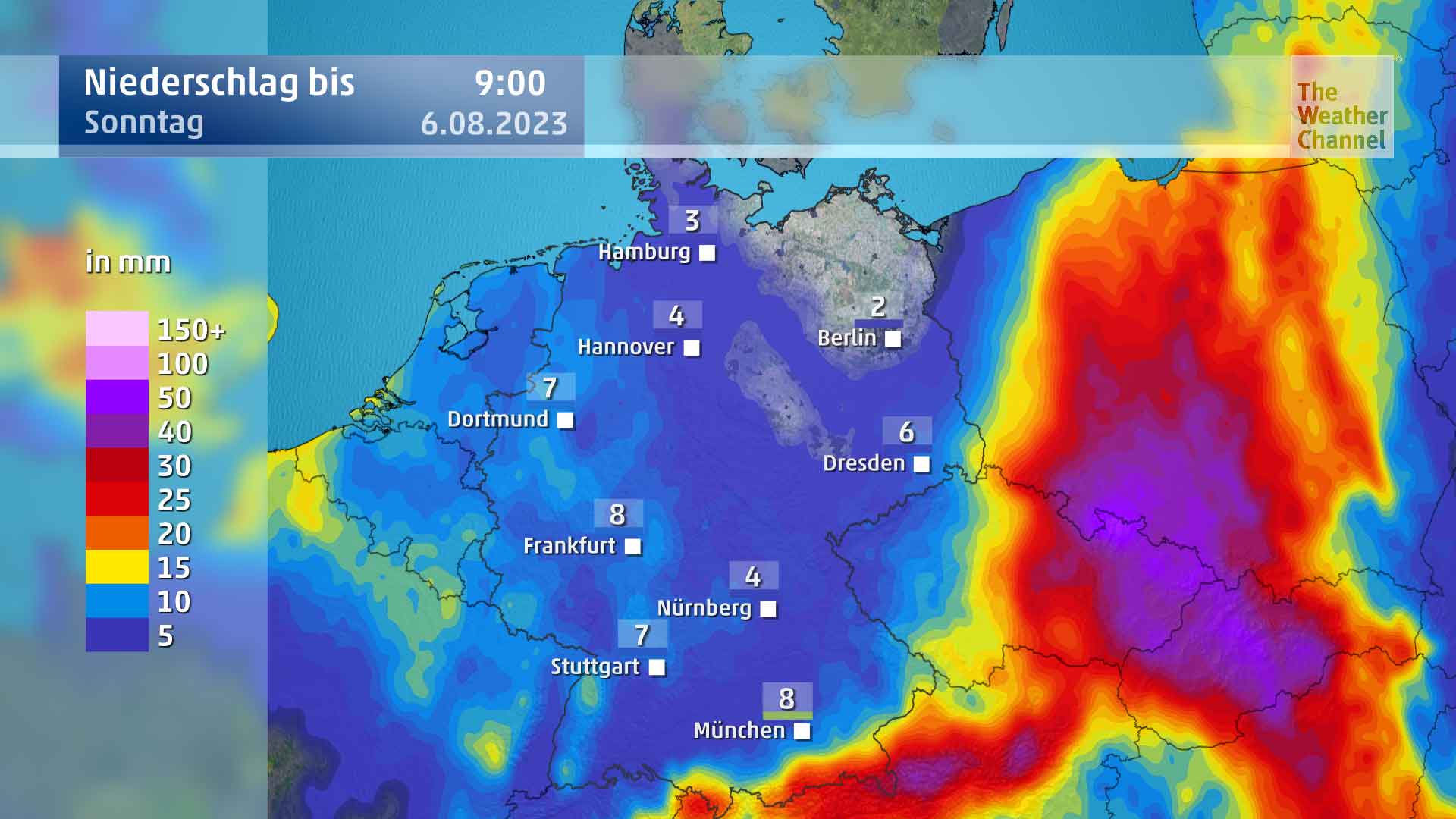 Insgesamt steht uns also ein verregnetes und für den Hochsommer vor allem am Sonntag auch ungewöhnlich kühles Wochenende bevor. Wirklich große Regenmengen und starke Regenfälle sind alles in allem jedoch nicht zu erwarten. Der über das gesamte Wochenende aufsummierte Niederschlag erreicht meistens Werte von 10-20 Litern pro Quadratmeter und bleibt somit im Durchschnitt.
