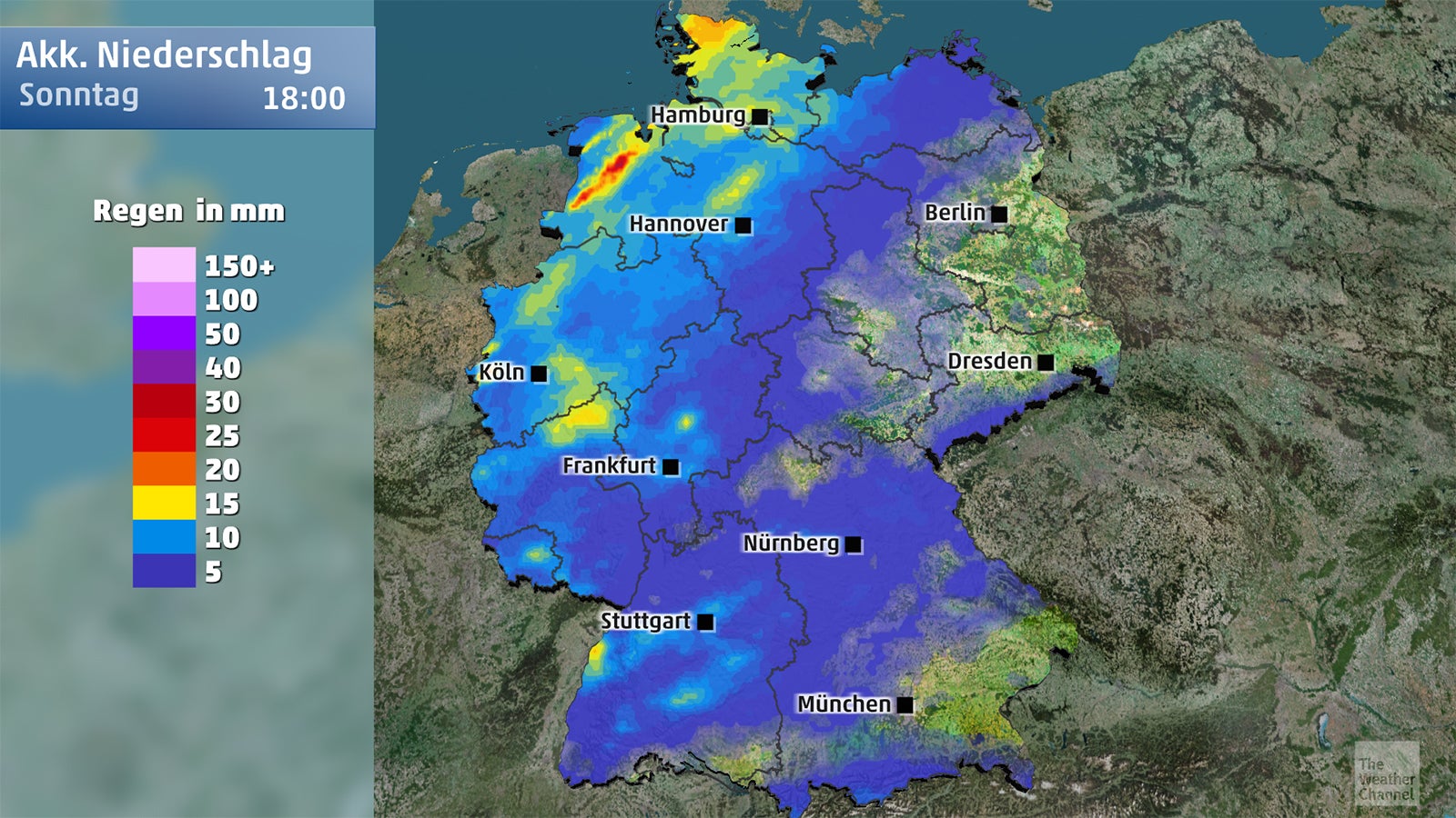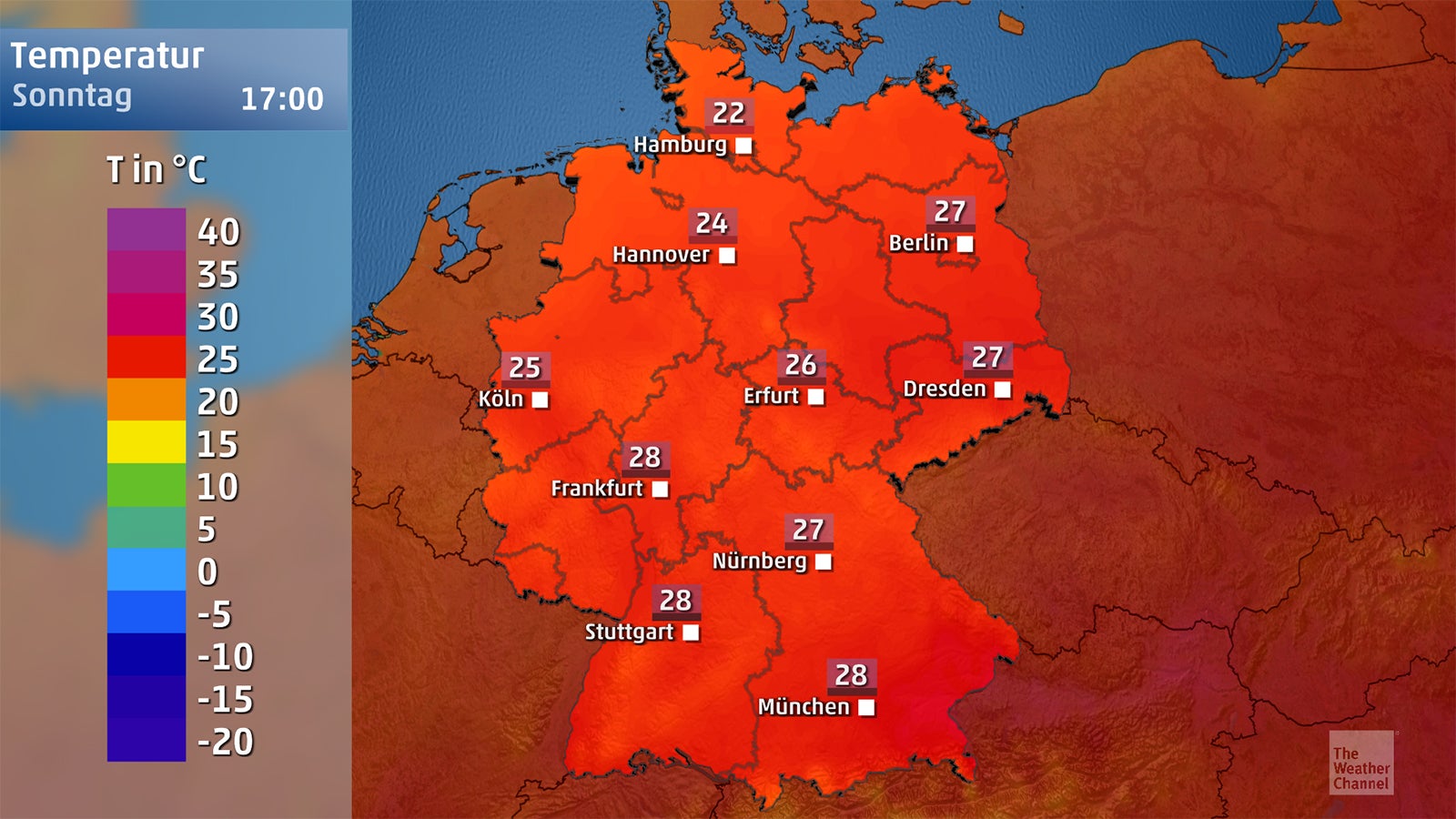 Am Sonntag erwartet uns im Norden und in der Mitte eine Verschnaufpause, bei trockenem Sommerwetter und harmlosen Wolken werden angenehme 22 bis 26 Grad erreicht. Im Süden ist es mit bis zu 30 Grad im Alpenvorland sowie entlang des Oberrheins wärmer, und deutlich schwüler.