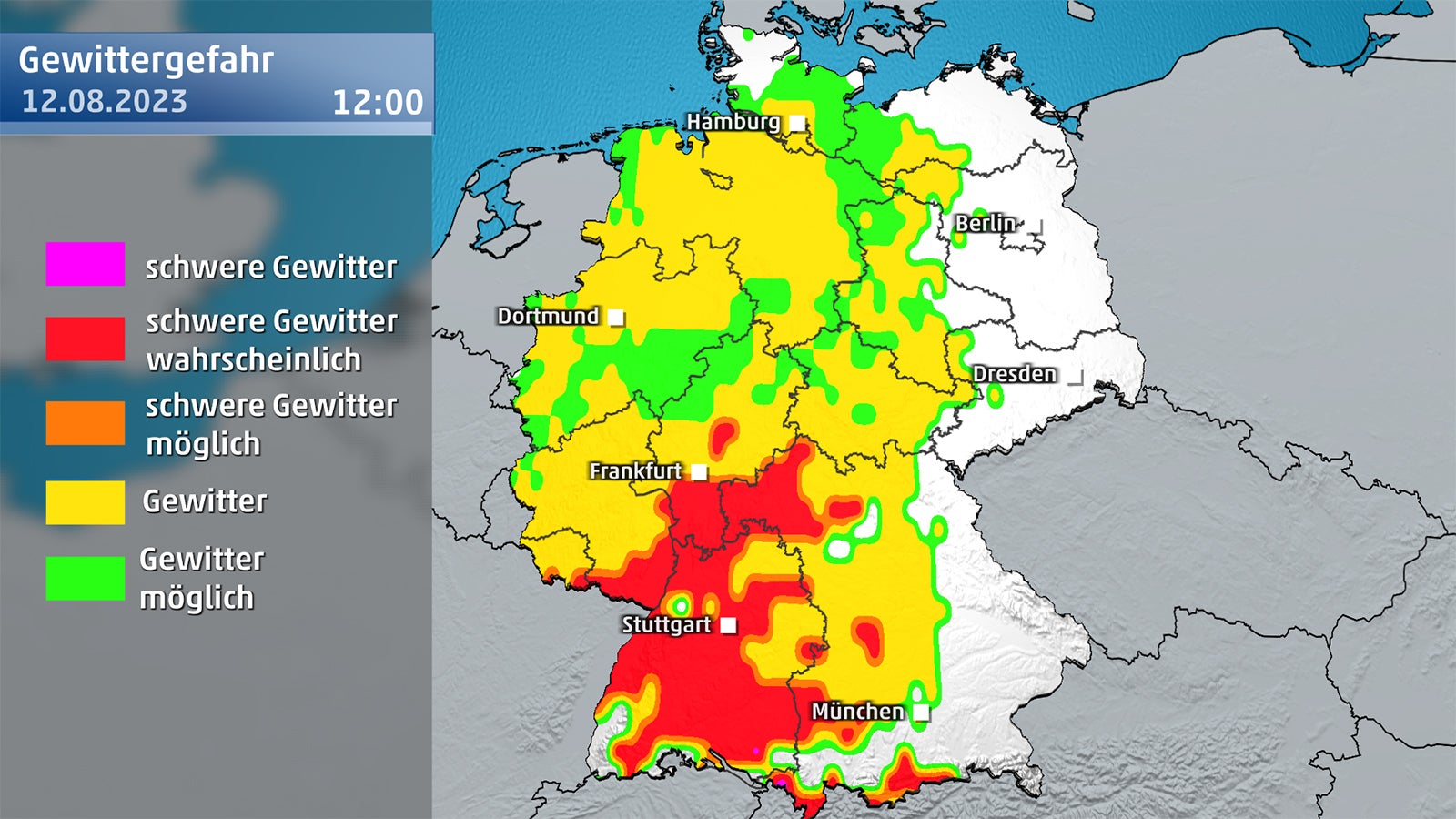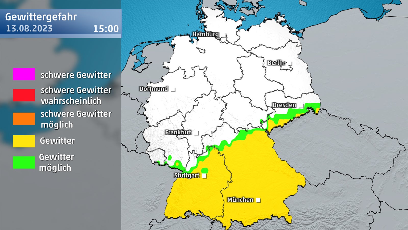 Schwül bedeutet auch: Es ist viel Feuchtigkeit in der Luft, eine wichtige Zutat für kräftige Gewitter. Betroffen sind am Sonntag besonders Baden-Württemberg und Bayern. Regional – vorzugsweise über der Alb – in der Oberpfalz und in Alpennähe entwickeln sich zum Nachmittag örtlich Gewitter mit Unwetterpotential. Auch Hagel und Starkregen werden ein Thema sein. Zum späten Abend könnten sich die Gewitter in Südostbayern zu einem größeren Gewitterkomplex zusammenbilden und ziehen dann nach Österreich ab.