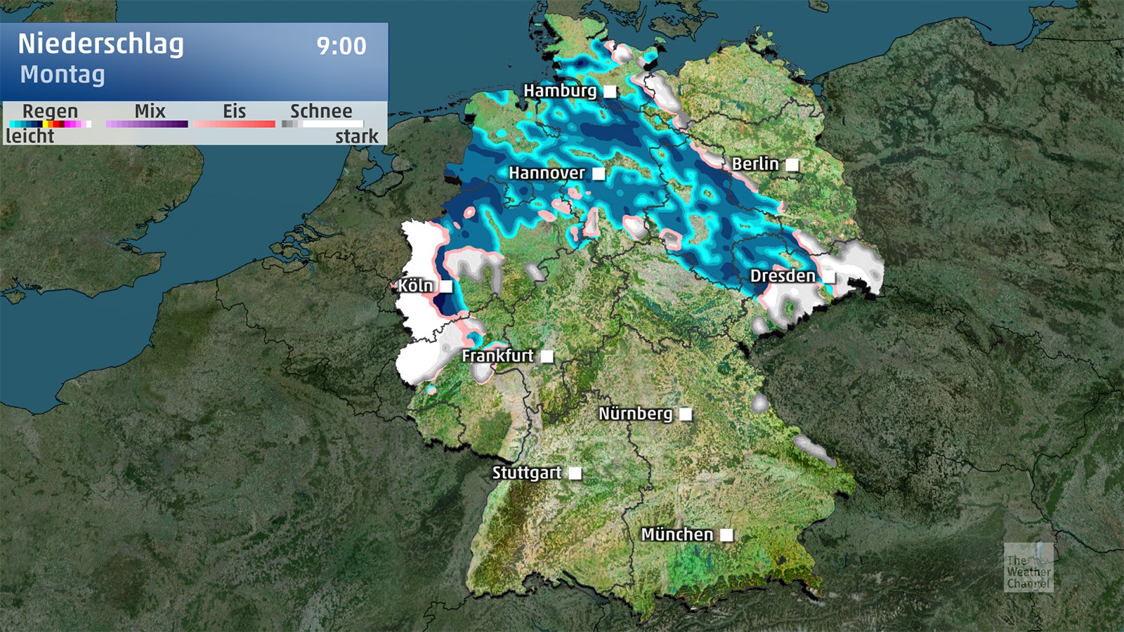 Nun zum Wochenwetter. Los geht’s am Montag mit Schneefall aus Westen, am Nachmittag schneit es dann in der Mitte und im Süden. Im Flachland und im Alpenvorland bleibt es allerdings bei Regen oder Schneeregen. Im Nordosten bleibt es trocken und bedeckt, in Ostsee- und Odernähe gibt es sonnige Chancen.