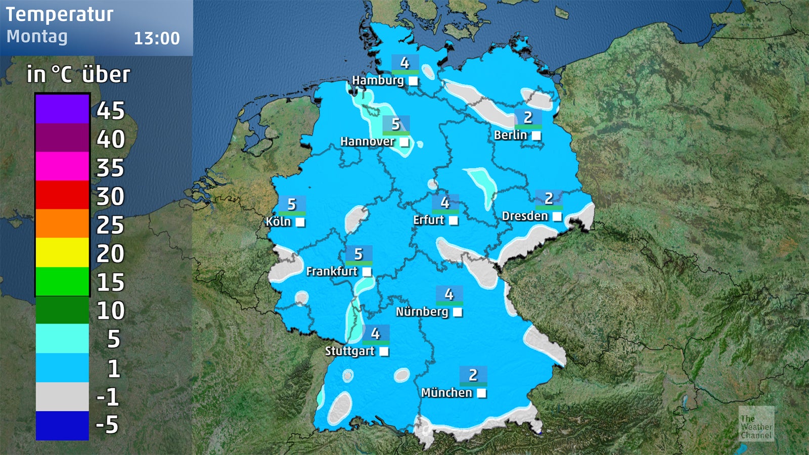 In den Mittelgebirgen und im Osten bleiben wir bei Temperaturen um den Gefrierpunkt, im Süden und Flachland bei 2 bis 5 Grad.